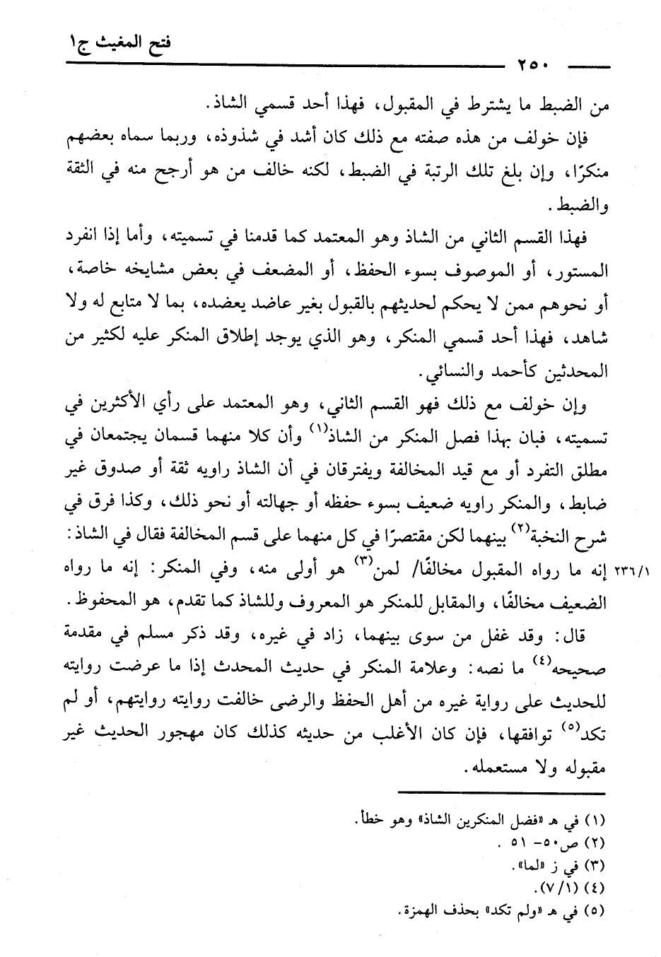 وَإِنْ خُولِفَ مَعَ ذَلِكَ، فَهُوَ الْقِسْمُ الثَّانِي، وَهُوَ الْمُعْتَمَدُ عَلَى رَأْيِ الْأَكْثَرِينَ فِي تَسْمِيَتِهِ، فَبَانَ بِهَذَا فَصْلُ الْمُنْكَرِ مِنَ الشَّاذِّ، وَأَنَّ كُلًّا مِنْهُمَا قِسْمَانِ يَجْتَمِعَانِ فِي مُطْلَقِ التَّفَرُّدِ أَوْ مَعَ قَيْدِ الْمُخَالَفَةِ، وَيَفْتَرِقَانِ فِي أَنَّ الشَّاذَّ رَاوِيهِ ثِقَةٌ أَوْ صَدُوقٌ غَيْرُ ضَابِطٍ، وَالْمُنْكَرَ رَاوِيهِ ضَعِيفٌ بِسُوءِ حِفْظِهِ أَوْ جَهَالَتِهِ أَوْ نَحْوِ ذَلِكَ، وَكَذَا فَرَّقَ فِي شَرْحِ النُّخْبَةِ بَيْنَهُمَا، لَكِنْ مُقْتَصِرًا فِي كُلٍّ مِنْهُمَا عَلَى قِسْمِ الْمُخَالَفَةِ، فَقَالَ فِي الشَّاذِّ: إِنَّهُ مَا رَوَاهُ الْمَقْبُولُ مُخَالِفًا لِمَنْ هُوَ أَوْلَى مِنْهُ، وَفِي الْمُنْكَرِ: إِنَّهُ مَا رَوَاهُ الضَّعِيفُ مُخَالِفًا، وَالْمُقَابِلُ لِلْمُنْكَرِ هُوَ الْمَعْرُوفُ، وَلِلشَّاذِّ كَمَا تَقَدَّمَ، هُوَ الْمَحْفُوظُ.