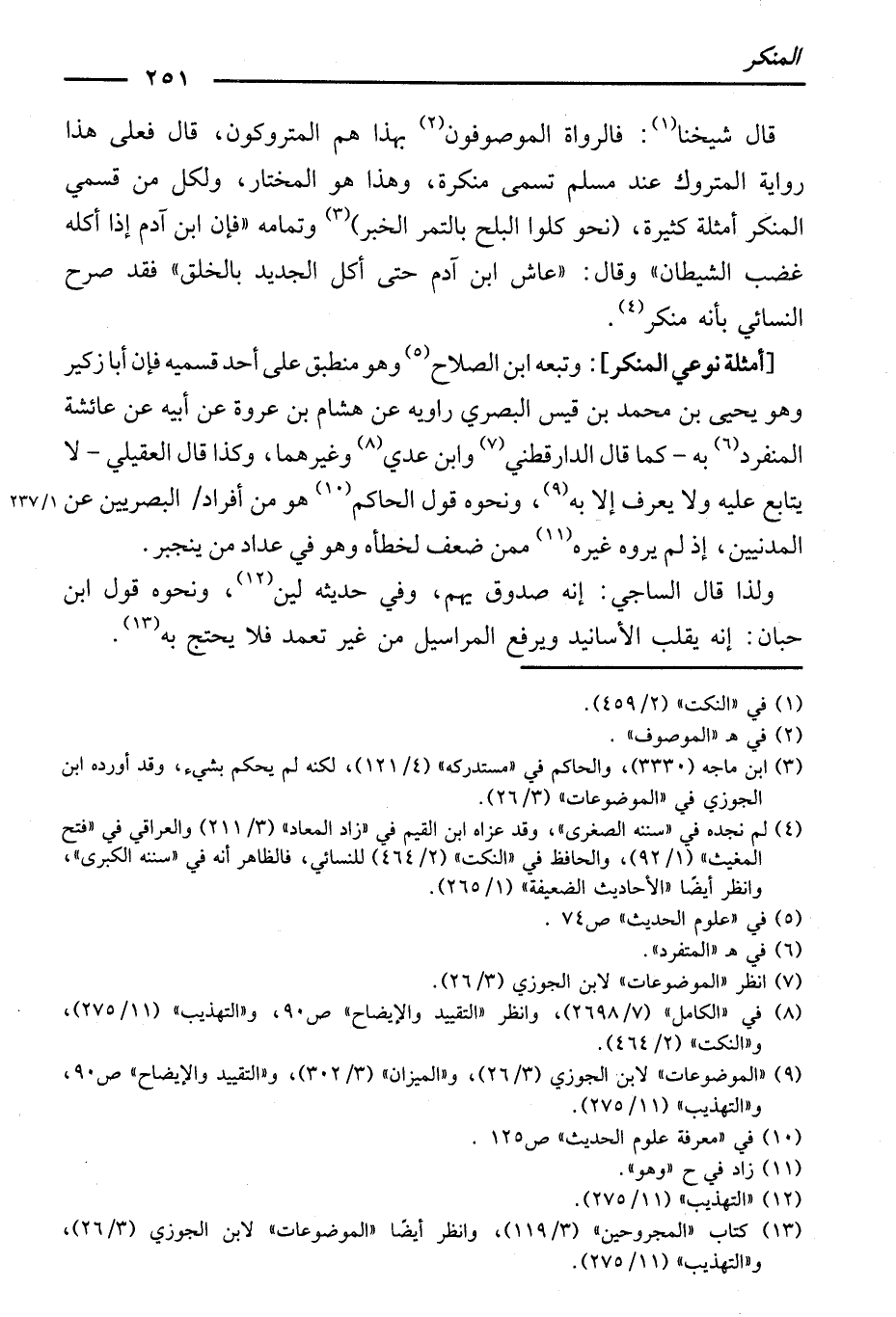 قَالَ شَيْخُنَا: فَالرُّوَاةُ الْمَوْصُوفُونَ بِهَذَا هُمُ الْمَتْرُوكُونَ، قَالَ: فَعَلَى هَذَا رِوَايَةُ الْمَتْرُوكِ عِنْدَ مُسْلِمٍ تُسَمَّى مُنْكَرَةً، وَهَذَا هُوَ الْمُخْتَارُ، وَلِكُلٍّ مِنْ قِسْمَيِ الْمُنْكَرِ أَمْثِلَةٌ كَثِيرَةٌ، (نَحْوُ: «كُلُوا الْبَلَحَ بِالتَّمْرِ» الْخَبَرَ) ، وَتَمَامُهُ: «فَإِنَّ ابْنَ آدَمَ إِذَا أَكَلَهُ غَضِبَ الشَّيْطَانُ» ، وَقَالَ: «عَاشَ ابْنُ آدَمَ حَتَّى أَكَلَ الْجَدِيدَ بِالْخَلِقِ» فَقَدْ صَرَّحَ النَّسَائِيُّ بِأَنَّهُ مُنْكَرٌ.