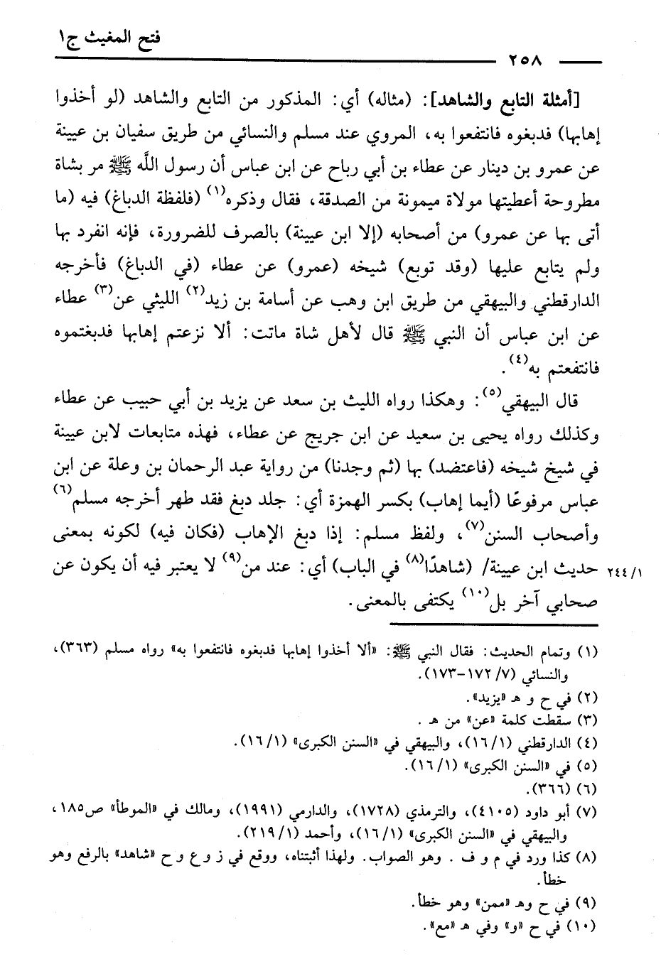 [أَمْثِلَةُ التَّابِعِ وَالشَّاهِدِ] (مِثَالُهُ) أَيِ: الْمَذْكُورِ مِنَ التَّابِعِ وَالشَّاهِدِ ( «لَوْ أَخَذُوا إِهَابَهَا، فَدَبَغُوهُ فَانْتَفَعُوا بِهِ» ) الْمَرْوِيُّ عِنْدَ مُسْلِمٍ وَالنَّسَائِيِّ مِنْ طَرِيقِ سُفْيَانَ بْنِ عُيَيْنَةَ، عَنْ عَمْرِو بْنِ دِينَارٍ، عَنْ عَطَاءِ بْنِ أَبِي رَبَاحٍ، عَنِ ابْنِ عَبَّاسٍ، «أَنَّ رَسُولَ اللَّهِ - صَلَّى اللَّهُ عَلَيْهِ وَسَلَّمَ - مَرَّ بِشَاةٍ مَطْرُوحَةٍ أُعْطِيَتْهَا مَوْلَاةَ مَيْمُونَةَ مِنَ الصَّدَقَةِ» ، فَقَالَ وَذَكَرَهُ.