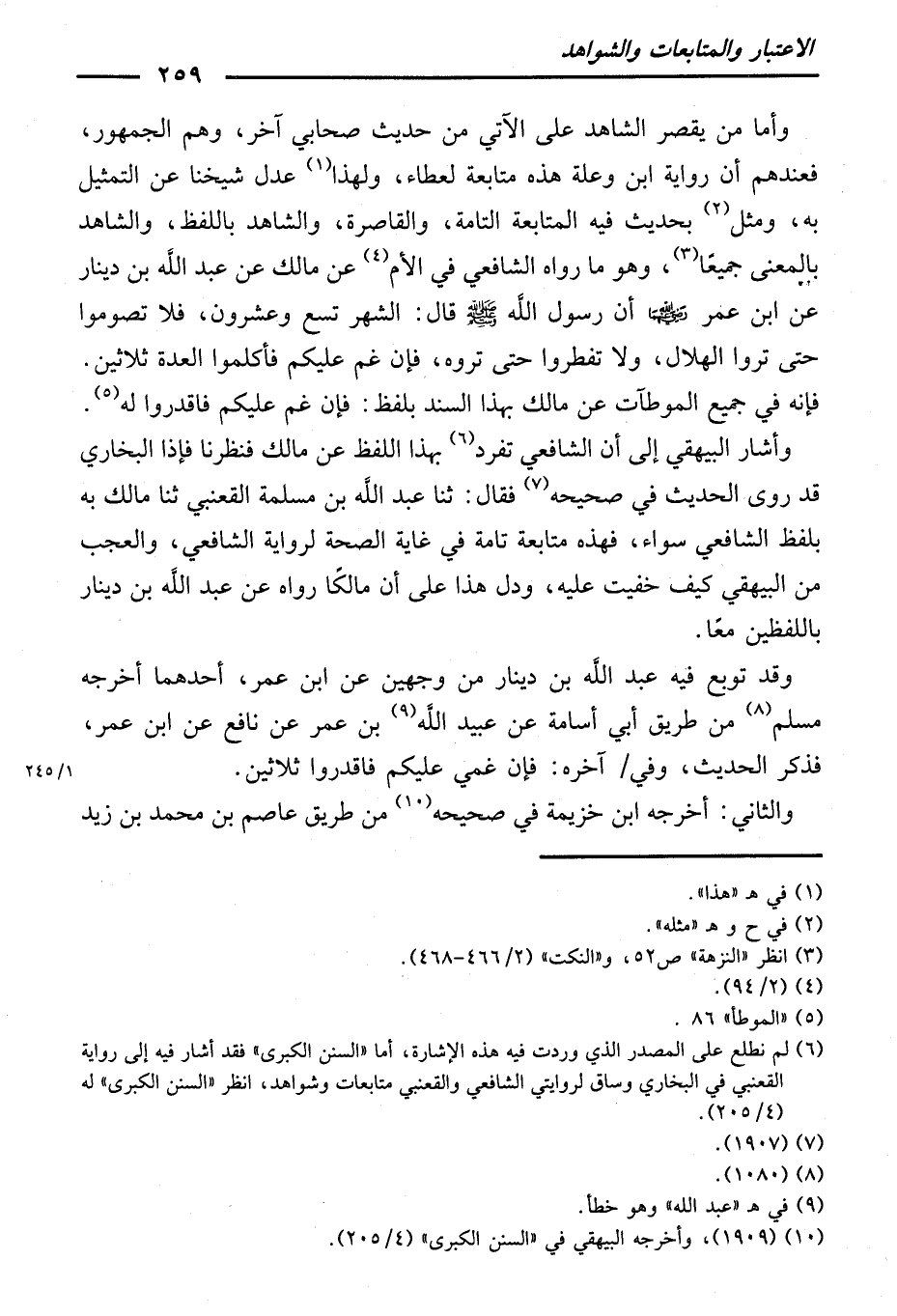 وَأَمَّا مَنْ يَقْصُرُ الشَّاهِدَ عَلَى الْآتِي مِنْ حَدِيثِ صَحَابِيٍّ آخَرَ، وَهُمُ الْجُمْهُورُ، فَعِنْدَهُمْ أَنَّ رِوَايَةَ ابْنِ وَعْلَةَ هَذِهِ مُتَابِعَةٌ لِعَطَاءِ، وَلِهَذَا عَدَلَ شَيْخُنَا عَنِ التَّمْثِيلِ بِهِ، وَمَثَّلَ بِحَدِيثٍ فِيهِ الْمُتَابَعَةُ التَّامَّةُ، وَالْقَاصِرَةُ، وَالشَّاهِدُ بِاللَّفْظِ، وَالشَّاهِدُ بِالْمَعْنَى جَمِيعًا، وَهُوَ مَا رَوَاهُ الشَّافِعِيُّ فِي الْأُمِّ عَنْ مَالِكٍ، عَنْ عَبْدِ اللَّهِ بْنِ دِينَارٍ، عَنِ ابْنِ عُمَرَ - رَضِيَ اللَّهُ عَنْهُمَا - أَنَّ رَسُولَ اللَّهِ - صَلَّى اللَّهُ عَلَيْهِ وَسَلَّمَ - قَالَ: «الشَّهْرُ تِسْعٌ وَعِشْرُونَ، فَلَا تَصُومُوا حَتَّى تَرَوُا الْهِلَالَ، وَلَا تُفْطِرُوا حَتَّى تَرَوْهُ، فَإِنْ غُمَّ عَلَيْكُمْ، فَأَكْمِلُوا الْعِدَّةَ ثَلَاثِينَ» ; فَإِنَّهُ فِي جَمِيعِ الْمُوَطَّآتِ عَنْ مَالِكٍ بِهَذَا السَّنَدِ بِلَفْظِ: «فَإِنْ غُمَّ عَلَيْكُمْ، فَاقْدُرُوا لَهُ» .