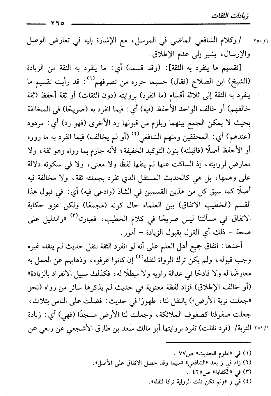 [تَقْسِيمُ مَا يَنْفَرِدُ بِهِ الثِّقَةُ] (وَقَدْ قَسَّمَهُ) أَيْ: مَا يَنْفَرِدُ بِهِ الثِّقَةُ مِنَ الزِّيَادَةِ (الشَّيْخُ) ابْنُ الصَّلَاحِ (فَقَالَ) : حَسْبَمَا حَرَّرَهُ مِنْ تَصَرُّفِهِمْ: قَدْ رَأَيْتُ تَقْسِيمَ مَا يَنْفَرِدُ بِهِ الثِّقَةُ إِلَى ثَلَاثَةِ أَقْسَامٍ: (مَا انْفَرَدْ) بِرِوَايَتِهِ (دُونَ الثِّقَاتِ) أَوْ ثِقَةٍ أَحْفَظَ (ثِقَةٌ خَالَفَهُمْ) أَوْ خَالَفَ الْوَاحِدُ الْأَحْفَظَ (فِيهِ) أَيْ: فِيمَا انْفَرَدَ بِهِ (صَرِيحًا) فِي الْمُخَالَفَةِ ; بِحَيْثُ لَا يُمْكِنُ الْجَمْعُ بَيْنَهُمَا، وَيَلْزَمُ مِنْ قَبُولِهَا رَدُّ الْأُخْرَى (فَهُوَ رَدٌّ) أَيْ: مَرْدُودٌ (عِنْدَهُمْ) أَيِ: الْمُحَقِّقِينَ، وَمِنْهُمُ الشَّافِعِيُّ.