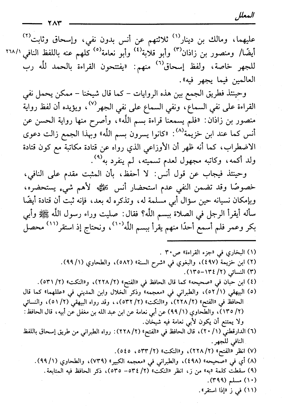 وَحِينَئِذٍ فَطَرِيقُ الْجَمْعِ بَيْنَ هَذِهِ الرِّوَايَاتِ - كَمَا قَالَ شَيْخُنَا - مُمْكِنٌ يُحْمَلِ نَفْيِ الْقِرَاءَةِ عَلَى نَفْيِ السَّمَاعِ، وَنَفْيِ السَّمَاعِ عَلَى نَفْيِ الْجَهْرِ، وَيُؤَيِّدُهُ أَنَّ لَفْظَ رِوَايَةِ مَنْصُورِ بْنِ زَاذَانَ: " فَلَمْ يُسْمِعْنَا قِرَاءَةَ بِسْمِ اللَّهِ "، وَأَصْرَحُ مِنْهَا رِوَايَةُ الْحَسَنِ عَنْ أَنَسٍ، كَمَا عِنْدَ ابْنِ خُزَيْمَةَ: " كَانُوا يُسِرُّونَ بِسْمِ اللَّهِ "، وَبِهَذَا الْجَمْعِ زَالَتْ دَعْوَى الِاضْطِرَابِ، كَمَا أَنَّهُ ظَهَرَ أَنَّ الْأَوْزَاعِيَّ الَّذِي رَوَاهُ عَنْ قَتَادَةَ مُكَاتَبَةً، مَعَ كَوْنِ قَتَادَةَ وُلِدَ أَكْمَهَ، وَكَاتِبُهُ مَجْهُولٌ لِعَدَمِ تَسْمِيَتِهِ - لَمْ يَنْفَرِدْ بِهِ.