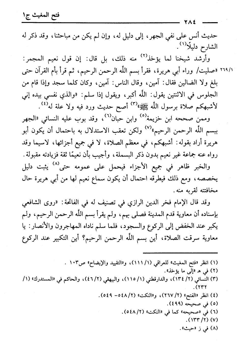 وَأَرْشَدَ شَيْخُنَا لِمَا يُؤْخَذُ مِنْهُ ذَلِكَ، بَلْ قَالَ: إِنَّ قَوْلَ نُعَيْمٍ الْمُجْمِرِ: " صَلَّيْتُ وَرَاءَ أَبِي هُرَيْرَةَ، فَقَرَأَ بِسْمِ اللَّهِ الرَّحْمَنِ الرَّحِيمِ، ثُمَّ قَرَأَ بِأُمِّ الْقُرْآنِ حَتَّى بَلَغَ وَلَا الضَّالِّينَ، فَقَالَ: آمِينَ، وَقَالَ النَّاسُ آمِينَ، وَكَانَ كُلَّمَا سَجَدَ وَإِذَا قَامَ مِنَ الْجُلُوسِ فِي الِاثْنَتَيْنِ، يَقُولُ: اللَّهُ أَكْبَرُ، وَيَقُولُ إِذَا سَلَّمَ: وَالَّذِي نَفْسِي بِيَدِهِ، إِنِّي لَأَشْبَهُكُمْ صَلَاةً بِرَسُولِ اللَّهِ - صَلَّى اللَّهُ عَلَيْهِ وَسَلَّمَ - أَصَحُّ حَدِيثٍ وَرَدَ فِيهِ، وَلَا عِلَّةَ لَهُ.