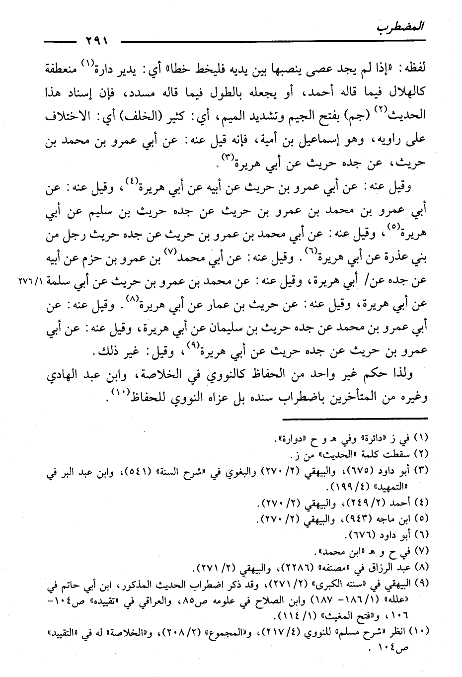 لَفْظُهُ: «إِذَا لَمْ يَجِدْ عَصًا يَنْصِبُهَا بَيْنَ يَدَيْهِ، فَلْيَخُطَّ خَطًّا» ; أَيْ يُدِيرُ دَارَةً مُنْعَطِفَةً كَالْهِلَالِ فِيمَا قَالَهُ أَحْمَدُ، أَوْ يَجْعَلُهُ بِالطُّولِ فِيمَا قَالَهُ مُسَدَّدٌ، فَإِنَّ إِسْنَادَ هَذَا الْحَدِيثِ (جَمُّ) بِفَتْحِ الْجِيمِ وَتَشْدِيدِ الْمِيمِ، أَيْ: كَثِيرُ (الْخُلْفِ) أَيِ الِاخْتِلَافِ عَلَى رَاوِيهِ، وَهُوَ إِسْمَاعِيلُ بْنُ أُمَيَّةَ ; فَإِنَّهُ قِيلَ: عَنْهُ، عَنْ أَبِي عَمْرِو بْنِ مُحَمَّدِ بْنِ حُرَيْثٍ، عَنْ جَدِّهِ حُرَيْثٍ، عَنْ أَبِي هُرَيْرَةَ.