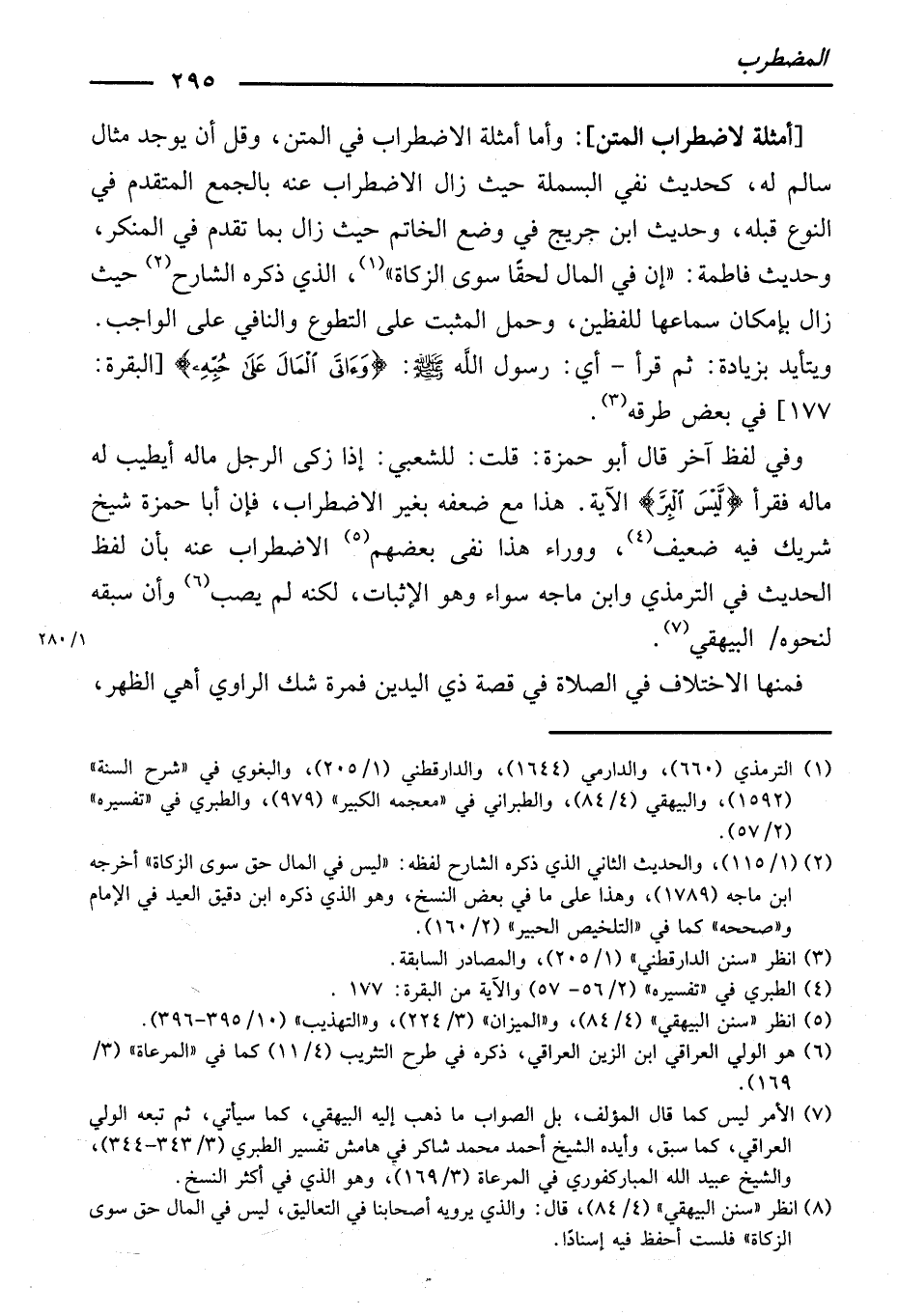 وَفِي لَفْظٍ آخَرَ: قَالَ أَبُو حَمْزَةَ: قُلْتُ لِلشَّعْبِيِّ: إِذَا زَكَّى الرَّجُلُ مَالَهُ، أَيَطِيبُ لَهُ مَالُهُ؟ فَقَرَأَ: لَيْسَ الْبِرَّ. . . . الْآيَةَ. هَذَا مَعَ ضَعْفِهِ بِغَيْرِ الِاضْطِرَابِ ; فَإِنَّ أَبَا حَمْزَةَ شَيْخُ شَرِيكٍ فِيهِ ضَعِيفٌ، وَوَرَاءَ هَذَا نَفَى بَعْضُهُمُ الِاضْطِرَابَ عَنْهُ بِأَنَّ لَفْظَ الْحَدِيثِ فِي التِّرْمِذِيِّ وَابْنِ مَاجَهْ سَوَاءٌ، وَهُوَ الْإِثْبَاتُ، لَكِنَّهُ لَمْ يُصِبْ، وَإِنْ سَبَقَهُ لِنَحْوِهِ الْبَيْهَقِيُّ.