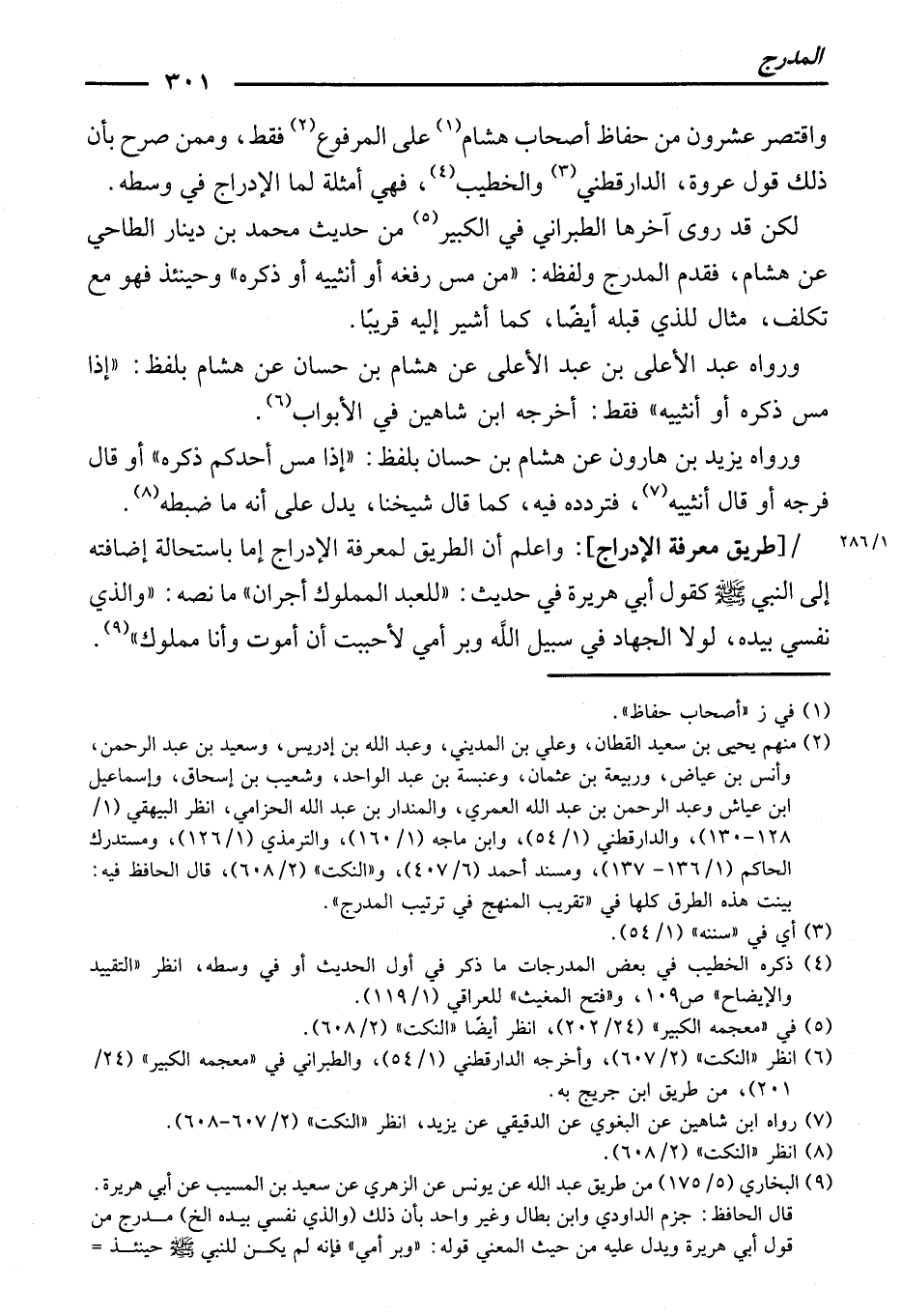 [طَرِيقُ مَعْرِفَةِ الْإِدْرَاجِ] وَاعْلَمْ أَنَّ الطَّرِيقَ لِمَعْرِفَةِ الْإِدْرَاجِ إِمَّا بِاسْتِحَالَةِ إِضَافَتِهِ إِلَى النَّبِيِّ - صَلَّى اللَّهُ عَلَيْهِ وَسَلَّمَ - كَقَوْلِ أَبِي هُرَيْرَةَ فِي حَدِيثِ: «لِلْعَبْدِ الْمَمْلُوكِ أَجْرَانِ» - مَا نَصُّهُ: «وَالَّذِي نَفْسِي بِيَدِهِ، لَوْلَا الْجِهَادُ فِي سَبِيلِ اللَّهِ وَبِرُّ أُمِّي، لَأَحْبَبْتُ أَنْ أَمُوتَ وَأَنَا مَمْلُوكٌ» .