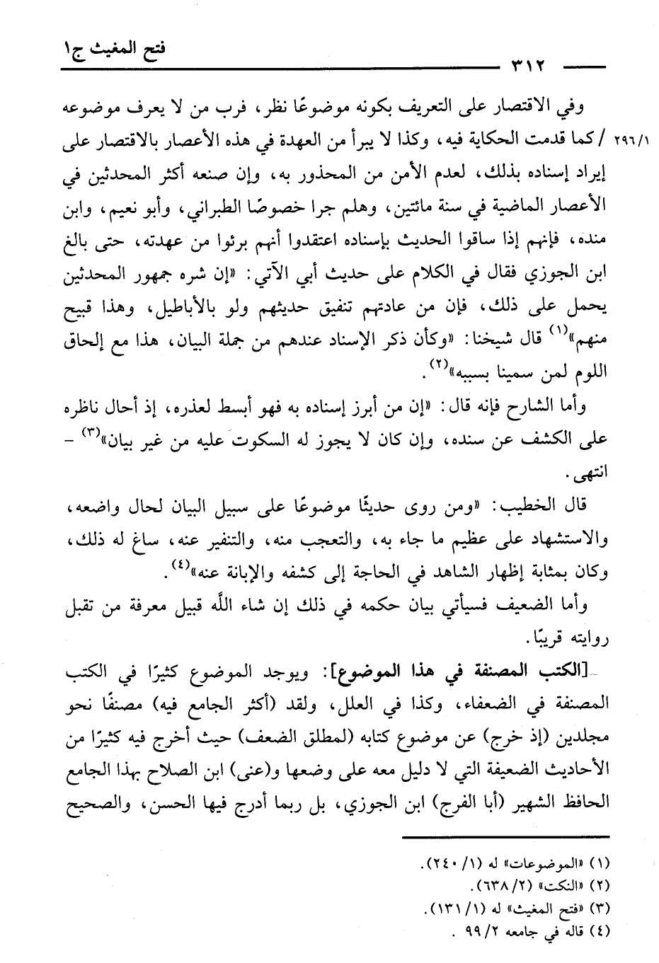 وَفِي الِاقْتِصَارِ عَلَى التَّعْرِيفِ بِكَوْنِهِ مَوْضُوعًا نَظَرٌ، فَرُبَّ مَنْ لَا يُعْرَفُ مَوْضُوعُهُ ; كَمَا قَدَّمْتُ الْحِكَايَةَ فِيهِ، وَكَذَا لَا يُبَرَّأُ مِنَ الْعُهْدَةِ فِي هَذِهِ الْأَعْصَارِ بِالِاقْتِصَارِ عَلَى إِيرَادِ إِسْنَادِهِ بِذَلِكَ ; لِعَدَمِ الْأَمْنِ مِنَ الْمَحْذُورِ بِهِ، وَإِنْ صَنَعَهُ أَكْثَرُ الْمُحَدِّثِينَ فِي الْأَعْصَارِ الْمَاضِيَةِ فِي سَنَةِ مِائَتَيْنِ، وَهَلُمَّ جَرًّا، خُصُوصًا الطَّبَرَانِيُّ، وَأَبُو نُعَيْمٍ، وَابْنُ مَنْدَهْ.