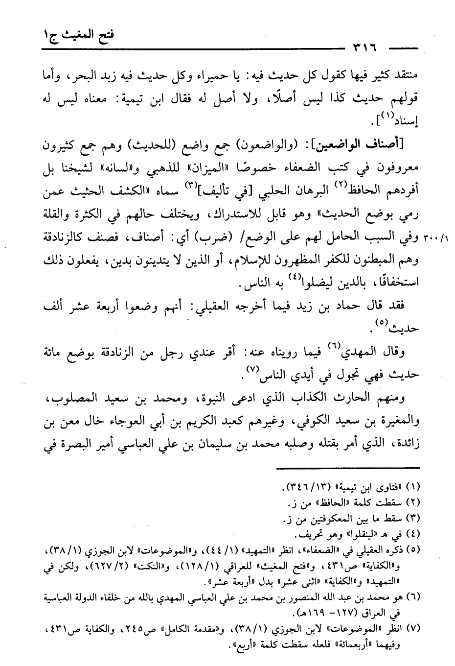 [أَصْنَافُ الْوَاضِعِينَ] (وَالْوَاضِعُونَ) جَمْعُ وَاضِعٍ (لِلْحَدِيثِ) وَهُمْ جَمْعٌ كَثِيرُونَ مَعْرُوفُونَ فِي كُتُبِ الضُّعَفَاءِ خُصُوصًا (الْمِيزَانَ) لِلذَّهَبِيِّ وَ " لِسَانَهُ " لِشَيْخِنَا، بَلْ أَفْرَدَهُمُ الْحَافِظُ الْبُرْهَانُ الْحَلَبِيُّ فِي تَأْلِيفٍ سَمَّاهُ (الْكَشْفَ الْحَثِيثَ عَمَّنْ رُمِيَ بِوَضْعِ الْحَدِيثِ) وَهُوَ قَابِلٌ لِلِاسْتِدْرَاكِ، وَيَخْتَلِفُ حَالُهُمْ فِي الْكَثْرَةِ وَالْقِلَّةِ.