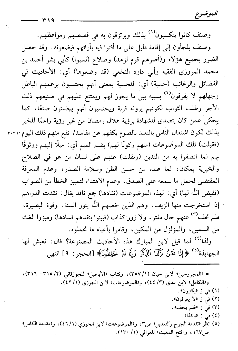 (فَبَيَّنُوا بِنَقْدِهِمْ فَسَادَهَا) ، وَمَيَّزُوا الْغَثَّ مِنَ السَّمِينِ، وَالْمُزَلْزَلَ مِنَ الْمَكِينِ، وَقَامُوا بِأَعْبَاءِ مَا تَحَمَّلُوهُ، وَلِذَا لَمَّا قِيلَ لِابْنِ الْمُبَارَكِ: هَذِهِ الْأَحَادِيثُ الْمَصْنُوعَةُ؟ قَالَ: تَعِيشُ لَهَا الْجَهَابِذَةُ، {إِنَّا نَحْنُ نَزَّلْنَا الذِّكْرَ وَإِنَّا لَهُ لَحَافِظُونَ} [الْحِجْرِ: 9] . انْتَهَى.