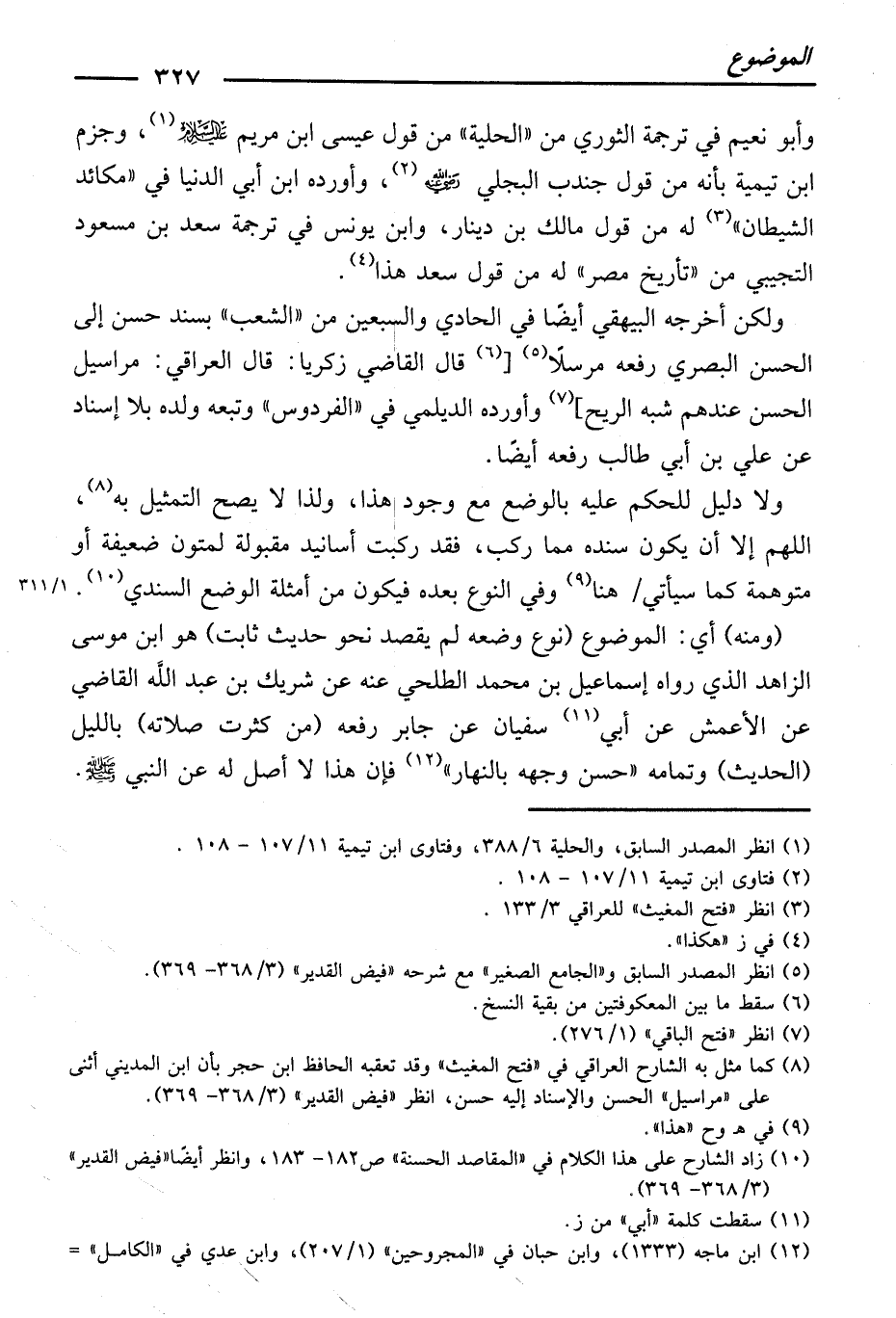 (وَمِنْهُ) أَيِ الْمَوْضُوعِ (نَوْعٌ وَضْعُهُ لَمْ يُقْصَدِ نَحْوُ حَدِيثِ ثَابِتٍ) هُوَ ابْنُ مُوسَى الزَّاهِدُ، الَّذِي رَوَاهُ إِسْمَاعِيلُ بْنُ مُحَمَّدٍ الطَّلْحِيُّ عَنْهُ عَنْ شَرِيكِ بْنِ عَبْدِ اللَّهِ الْقَاضِي، عَنِ الْأَعْمَشِ عَنْ أَبِي سُفْيَانَ عَنْ جَابِرٍ رَفَعَهُ: (مَنْ كَثُرَتْ صَلَاتُهُ) بِاللَّيْلِ. . . . . . (الْحَدِيثَ) ، وَتَمَامُهُ: " حَسُنَ وَجْهُهُ بِالنَّهَارِ " فَإِنَّ هَذَا لَا أَصْلَ لَهُ عَنِ النَّبِيِّ صَلَّى اللَّهُ عَلَيْهِ وَسَلَّمَ.