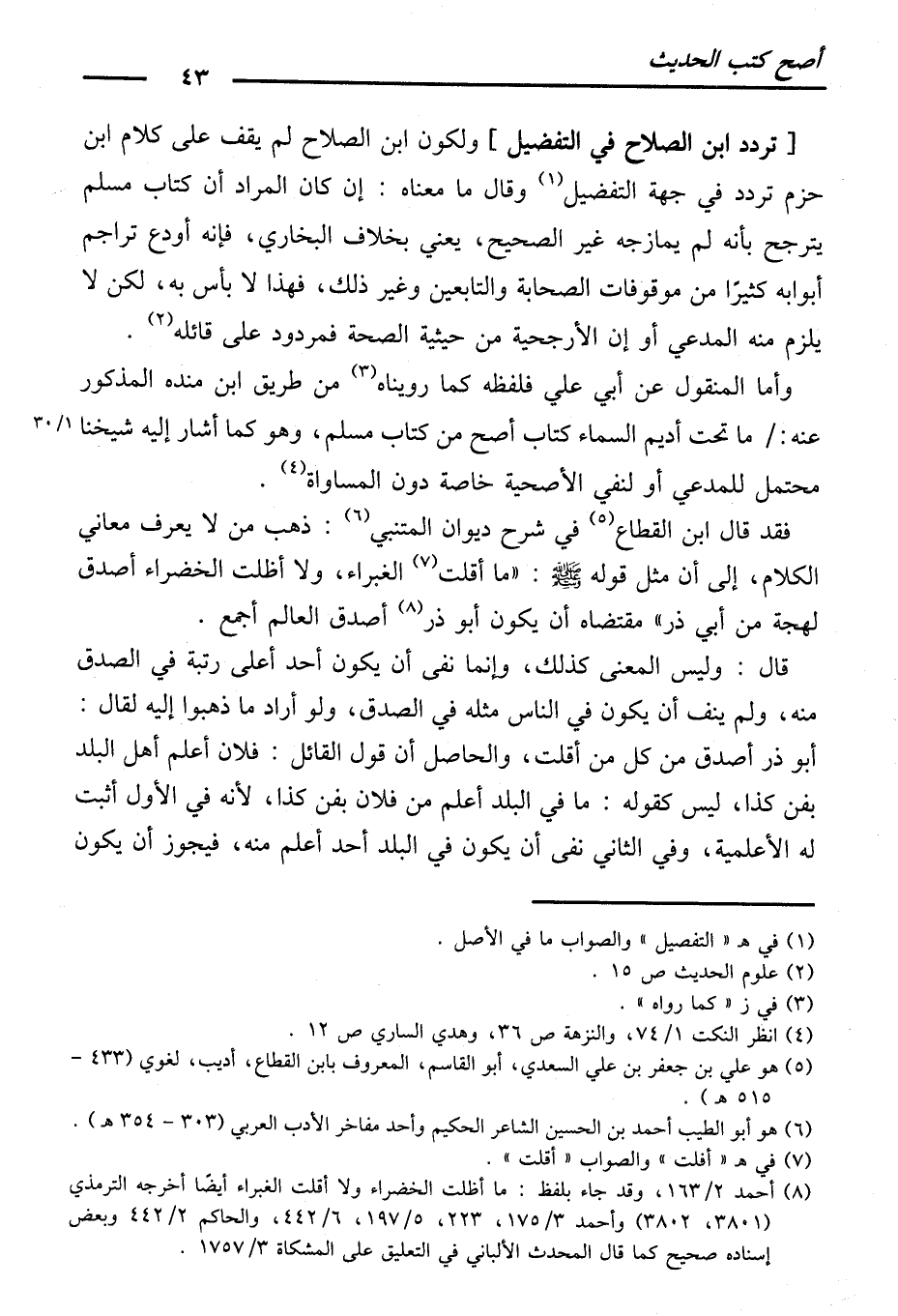 وَأَمَّا الْمَنْقُولُ عَنْ أَبِي عَلِيٍّ فَلَفْظُهُ كَمَا رُوِّينَاهُ مِنْ طَرِيقِ ابْنِ مَنْدَهْ الْمَذْكُورِ عَنْهُ: (مَا تَحْتَ أَدِيمِ السَّمَاءِ كِتَابٌ أَصَحُّ مِنْ كِتَابِ مُسْلِمٍ) . وَهُوَ كَمَا أَشَارَ إِلَيْهِ شَيْخُنَا مُحْتَمِلٌ لِلْمُدَّعَى، أَوْ لِنَفْيِ الْأَصَحِّيَّةِ خَاصَّةً دُونَ الْمُسَاوَاةِ.