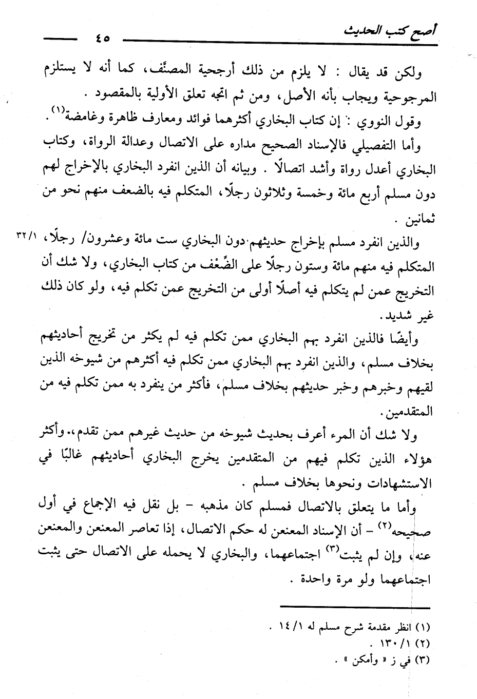 وَأَمَّا التَّفْصِيلِيُّ: فَالْإِسْنَادُ الصَّحِيحُ مَدَارُهُ عَلَى الِاتِّصَالِ وَعَدَالَةِ الرُّوَاةِ، وَكِتَابُ الْبُخَارِيِّ أَعْدَلُ رُوَاةً وَأَشَدُّ اتِّصَالًا. وَبَيَانُهُ أَنَّ الَّذِينَ انْفَرَدَ الْبُخَارِيُّ بِالْإِخْرَاجِ لَهُمْ دُونَ مُسْلِمٍ أَرْبَعُمِائَةٍ وَخَمْسَةٌ وَثَلَاثُونَ رَجُلًا، الْمُتَكَلَّمُ فِيهِ بِالضَّعْفِ مِنْهُمْ نَحْوٌ مِنْ ثَمَانِينَ.