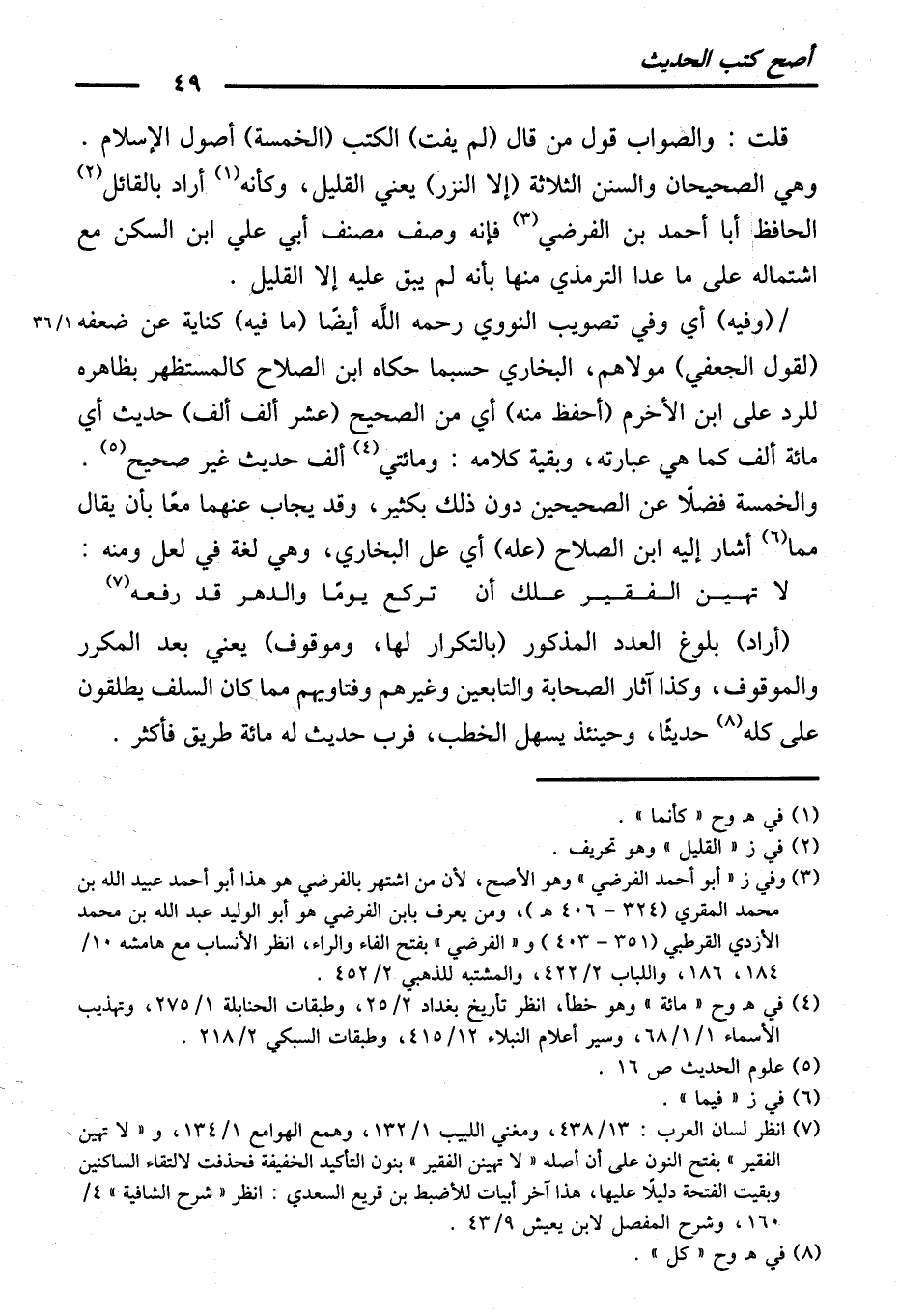 قُلْتُ: وَالصَّوَابُ قَوْلُ مَنْ قَالَ (لَمْ يَفُتِ) الْكُتُبَ (الْخَمْسَةَ) أُصُولَ الْإِسْلَامِ ; وَهِيَ: الصَّحِيحَانِ وَالسُّنَنُ الثَّلَاثَةُ (إِلَّا النَّزْرُ) يَعْنِي الْقَلِيلَ، وَكَأَنَّهُ أَرَادَ بِالْقَائِلِ الْحَافِظَ أَبَا أَحْمَدَ بْنَ الْفَرَضِيِّ، فَإِنَّهُ وَصَفَ مُصَنَّفَ أَبِي عَلِيِّ بْنِ السَّكَنِ مَعَ اشْتِمَالِهِ عَلَى مَا عَدَا التِّرْمِذِيِّ مِنْهَا بِأَنَّهُ لَمْ يَبْقَ عَلَيْهِ إِلَّا الْقَلِيلُ.