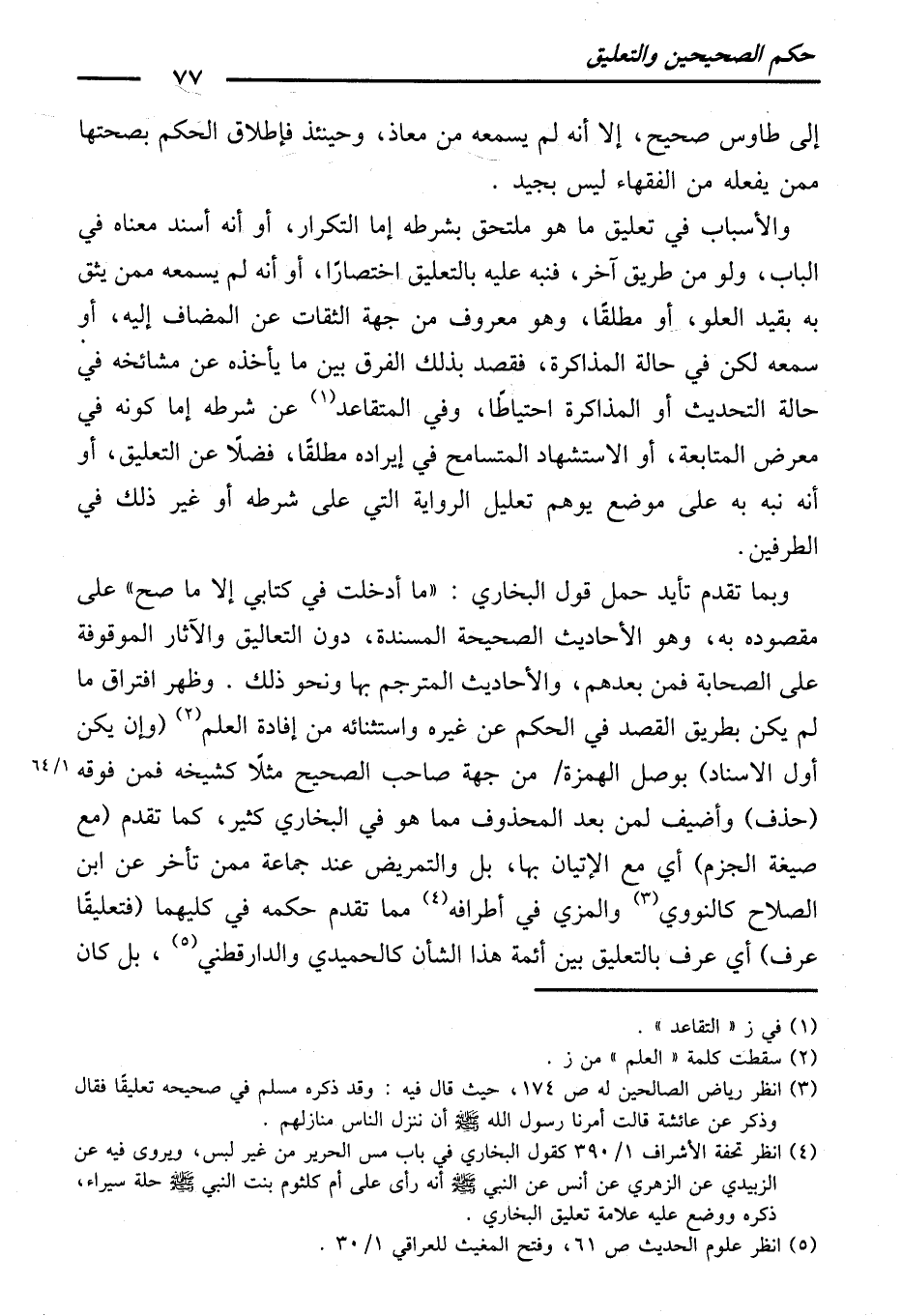 وَالْأَسْبَابُ فِي تَعْلِيقِ مَا هُوَ مُلْتَحِقٌ بِشَرْطِهِ: إِمَّا التَّكْرَارُ، أَوْ أَنَّهُ أَسْنَدَ مَعْنَاهُ فِي الْبَابِ، وَلَوْ مِنْ طَرِيقٍ آخَرَ، فَنَبَّهَ عَلَيْهِ بِالتَّعْلِيقِ اخْتِصَارًا، أَوْ أَنَّهُ لَمْ يَسْمَعْهُ مِمَّنْ يَثِقُ بِهِ بِقَيْدِ الْعُلُوِّ، أَوْ مُطْلَقًا، وَهُوَ مَعْرُوفٌ مِنْ جِهَةِ الثِّقَاتِ عَنِ الْمُضَافِ إِلَيْهِ، أَوْ سَمِعَهُ لَكِنْ فِي حَالَةِ الْمُذَاكَرَةِ، فَقَصَدَ بِذَلِكَ الْفَرْقَ بَيْنَ مَا يَأْخُذُهُ عَنْ مَشَائِخِهِ فِي حَالَةِ التَّحْدِيثِ أَوِ الْمُذَاكَرَةِ احْتِيَاطًا.