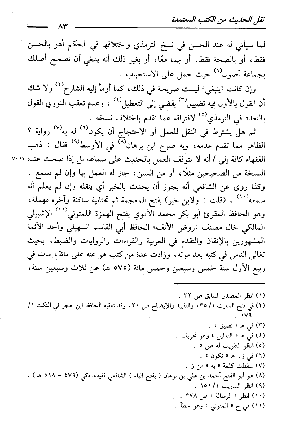 لِمَا سَيَأْتِي لَهُ عِنْدَ الْحَسَنِ فِي نُسَخِ التِّرْمِذِيِّ وَاخْتِلَافِهَا فِي الْحُكْمِ ; أَهُوَ بِالْحُسْنِ فَقَطْ، أَوْ بِالصِّحَّةِ فَقَطْ، أَوْ بِهِمَا مَعًا، أَوْ بِغَيْرِ ذَلِكَ أَنَّهُ يَنْبَغِي أَنْ تُصَحِّحَ أَصْلَكَ بِجَمَاعَةِ أُصُولٍ حَيْثُ حُمِلَ عَلَى الِاسْتِحْبَابِ؟ وَإِنْ كَانَتْ " يَنْبَغِي " لَيْسَتْ صَرِيحَةً فِي ذَلِكَ، كَمَا أَوْمَأَ إِلَيْهِ الشَّارِحُ، وَلَا شَكَّ أَنَّ الْقَوْلَ بِالْأَوَّلِ فِيهِ تَضْيِيقٌ يُفْضِي إِلَى التَّعْطِيلِ، وَعَدَمِ تَعَقُّبِ النَّوَوِيِّ الْقَوْلَ بِالتَّعَدُّدِ فِي التِّرْمِذِيِّ ; لِافْتِرَاقِهِ عَمَّا تَقَدَّمَ بِاخْتِلَافِ نُسَخِهِ.