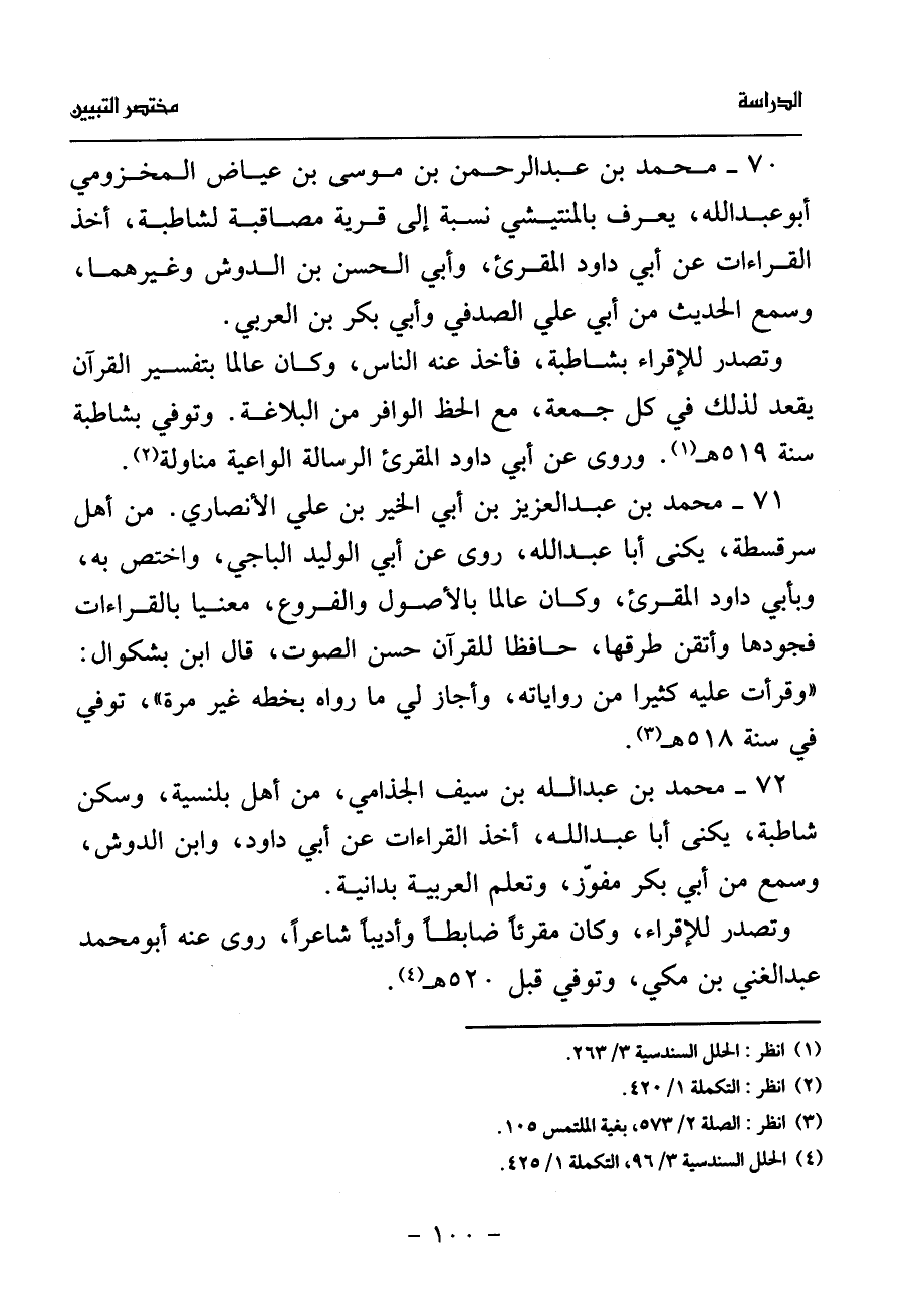 70 - محمد بن عبد الرحمن بن موسى بن عياض المخزومي أبو عبد الله، يعرف بالمنتيشي نسبة إلى قرية مصاقبة لشاطبة، أخذ القراءات عن أبي داود المقرئ، وأبي الحسن بن الدوش وغيرهما، وسمع الحديث من أبي علي الصدفي وأبي بكر بن العربي.