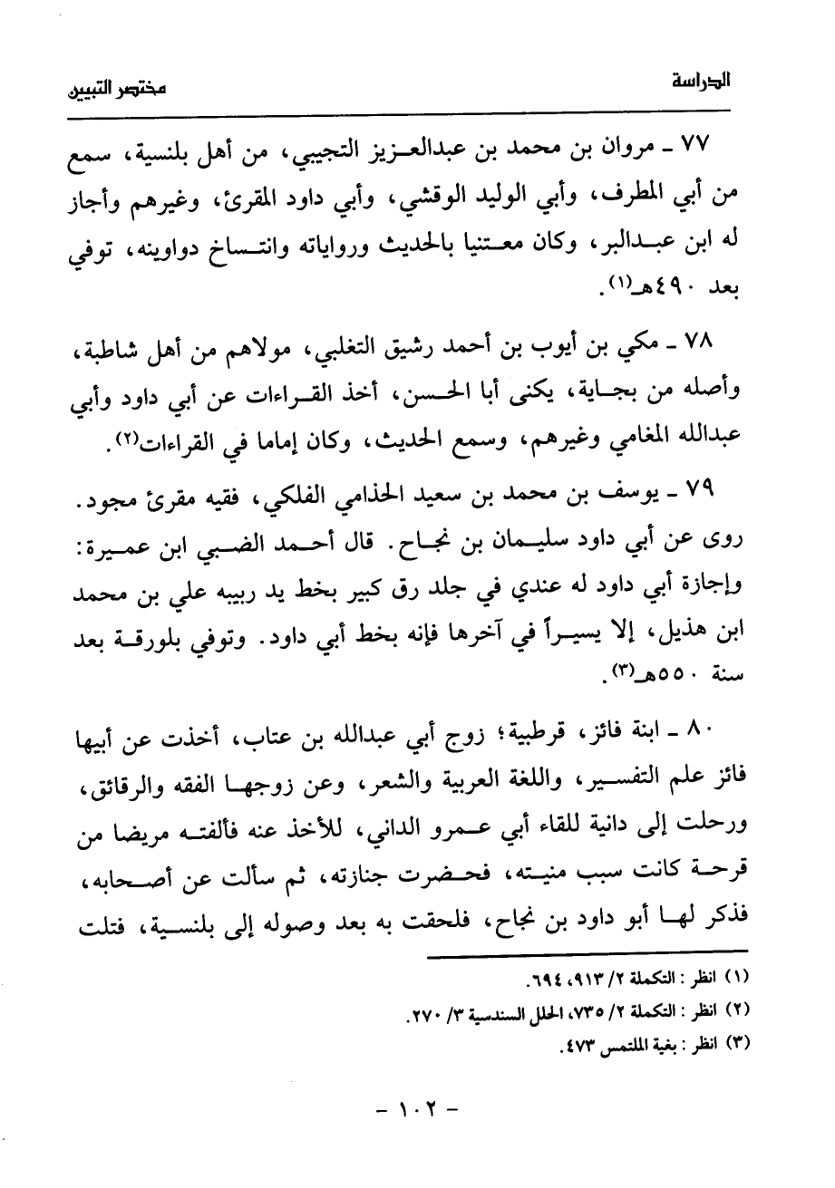 77 - مروان بن محمد بن عبد العزيز التجيبي، من أهل بلنسية، سمع من أبي المطرف، وأبي الوليد الوقشي، وأبي داود المقرئ، وغيرهم وأجاز له ابن عبد البر، وكان معتنيا بالحديث ورواياته وانتساخ دواوينه، توفي بعد 490 هـ (¬1).