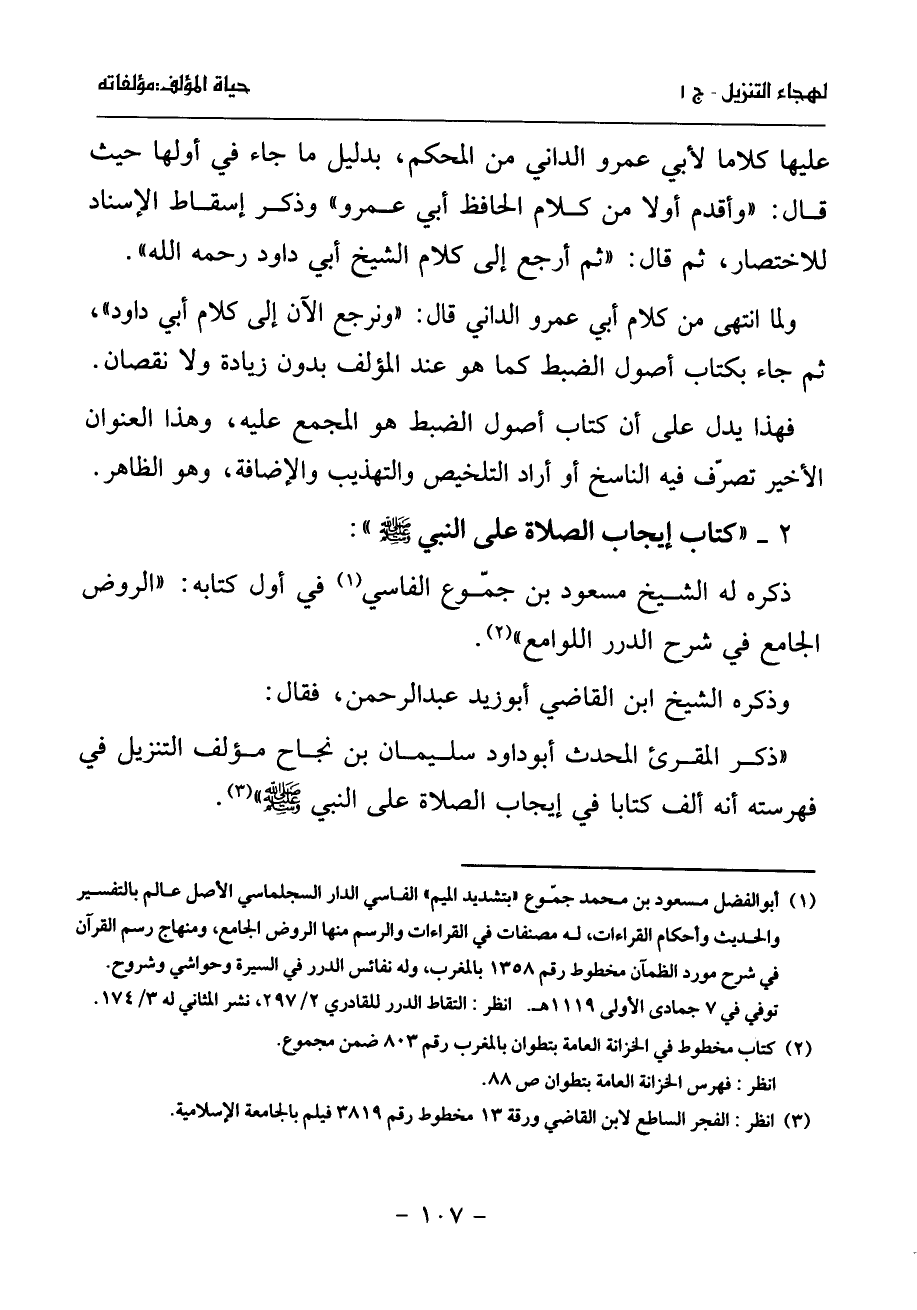 «ذكر المقرئ المحدث أبو داود سليمان بن نجاح مؤلف التنزيل في فهرسته أنه ألف كتابا في إيجاب الصلاة على النبي صلى الله عليه وسلّم» (¬3).