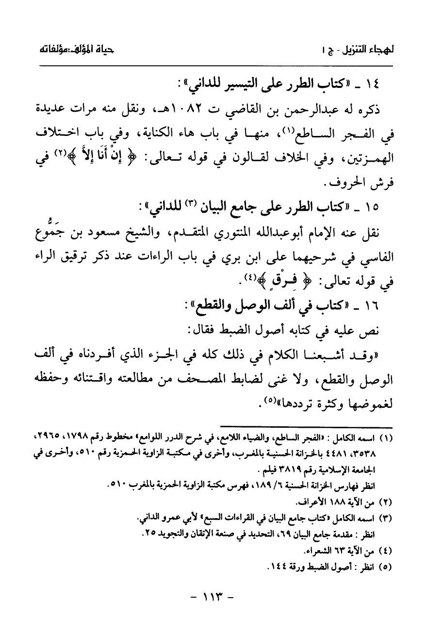 «وقد أشبعنا الكلام في ذلك كله في الجزء الذي أفردناه في ألف الوصل والقطع، ولا غنى لضابط المصحف من مطالعته واقتنائه وحفظه لغموضها وكثرة ترددها» (¬5).