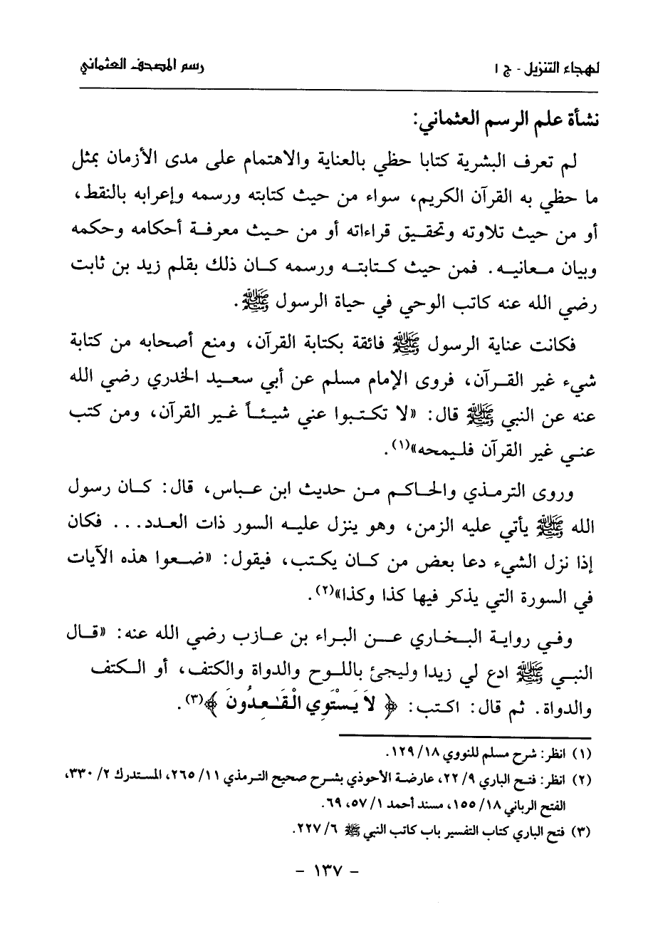 (¬2) انظر: فتح الباري 9/ 22، عارضة الأحوذي بشرح صحيح الترمذي 11/ 265، المستدرك 2/ 330، الفتح الرباني 18/ 155، مسند أحمد 1/ 57، 69.