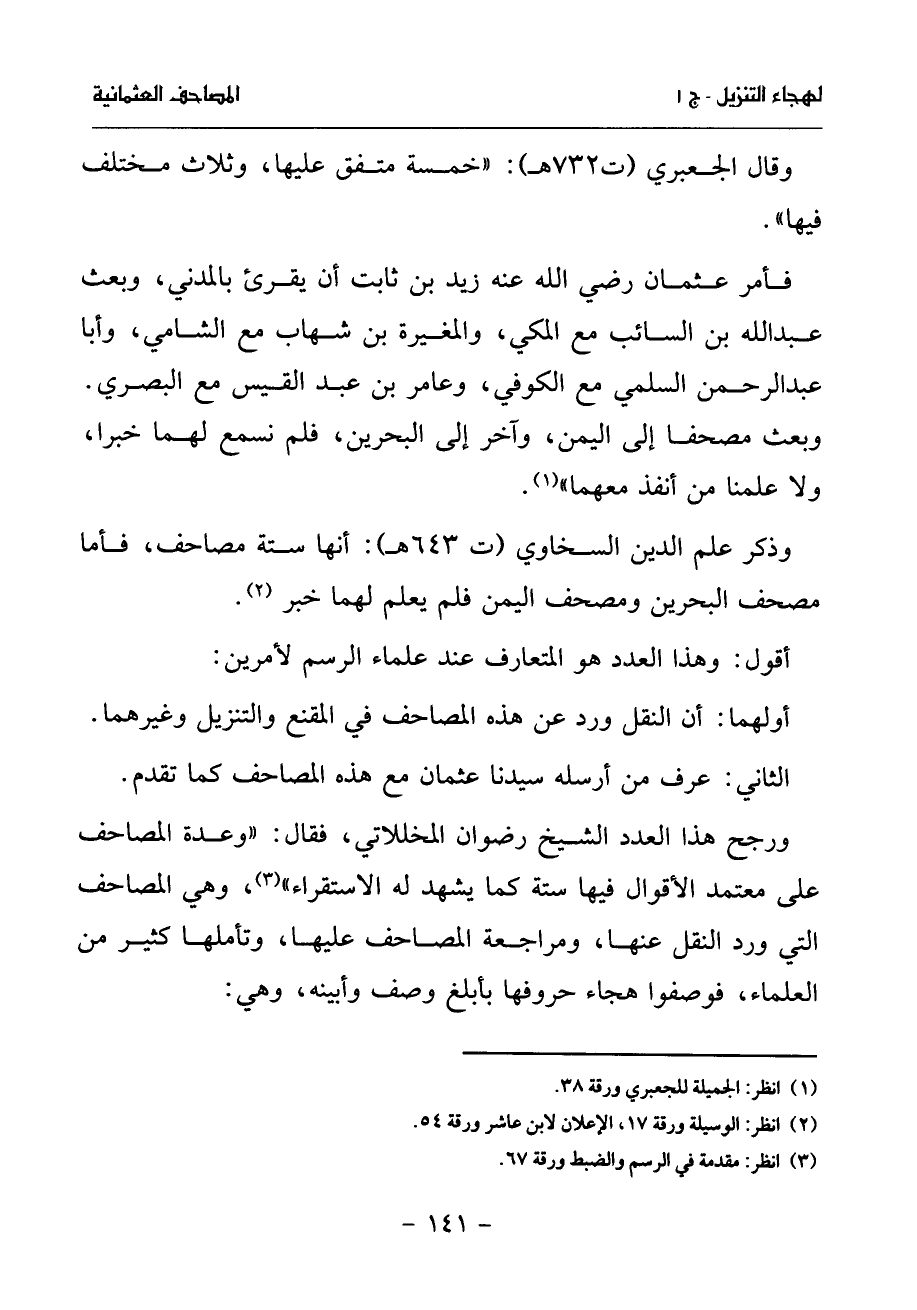ورجح هذا العدد الشيخ رضوان المخللاتي، فقال: «وعدة المصاحف على معتمد الأقوال فيها ستة كما يشهد له الاستقراء» (¬3)، وهي المصاحف التي ورد النقل عنها، ومراجعة المصاحف عليها، وتأملها كثير من العلماء، فوصفوا هجاء حروفها بأبلغ وصف وأبينه، وهي: