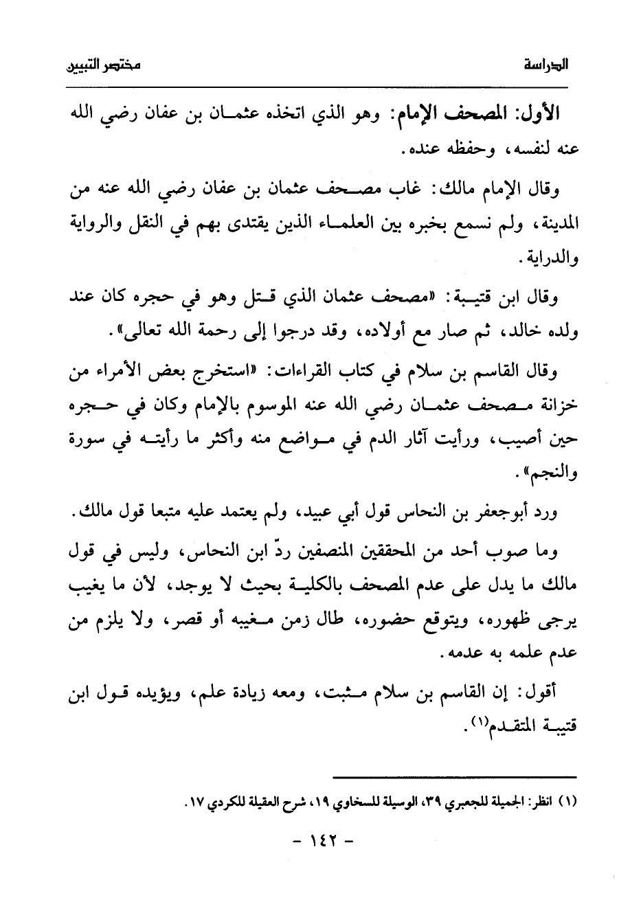 وقال القاسم بن سلام في كتاب القراءات: «استخرج بعض الأمراء من خزانة مصحف عثمان رضي الله عنه الموسوم بالإمام وكان في حجره حين أصيب، ورأيت آثار الدم في مواضع منه وأكثر ما رأيته في سورة والنجم».