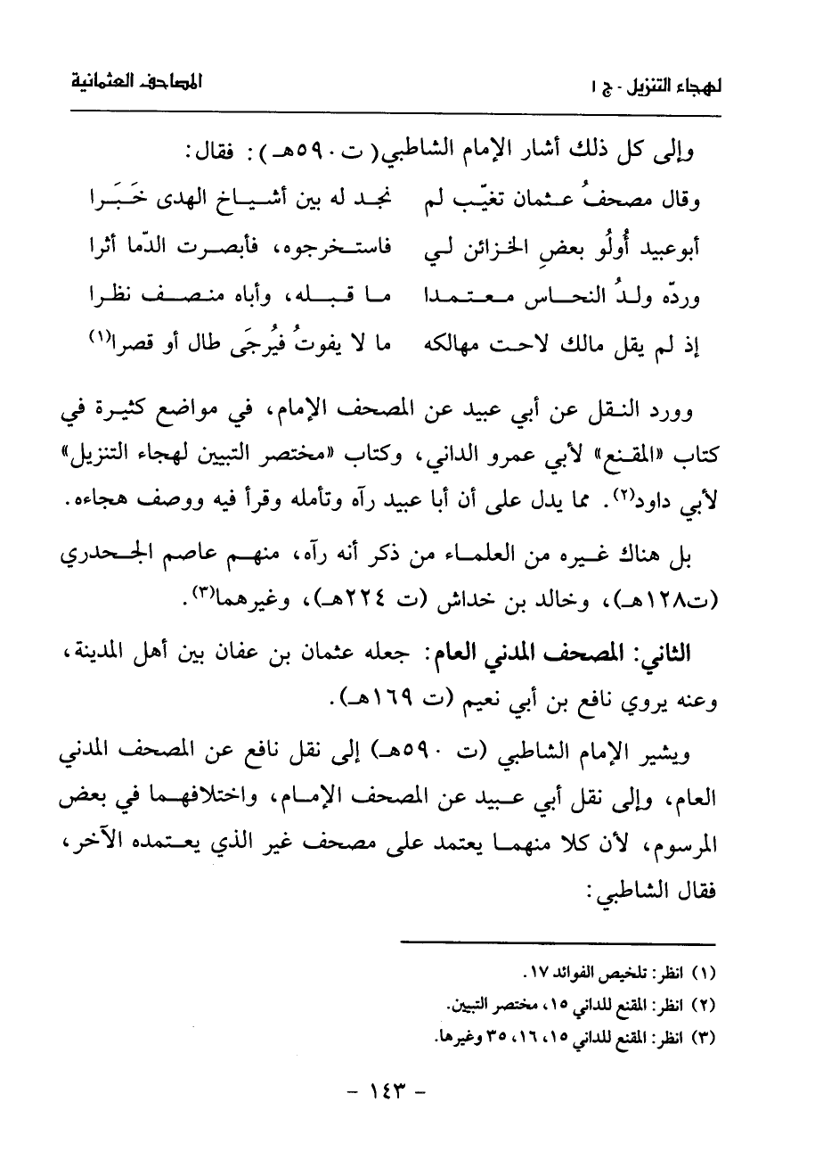 وقال مصحف عثمان تغيّب لم* نجد له بين أشياخ الهدى خبرا أبو عبيد أولو بعض الخزائن لي* فاستخرجوه، فأبصرت الدّما أثرا وردّه ولد النحاس معتمدا* ما قبله، وأباه منصف نظرا إذ لم يقل مالك لاحت مهالكه* ما لا يفوت فيرجى طال أو قصرا (¬1) وورد النقل عن أبي عبيد عن المصحف الإمام، في مواضع كثيرة في كتاب «المقنع» لأبي عمرو الداني، وكتاب «مختصر التبيين لهجاء التنزيل» لأبي داود (¬2). مما يدل على أن أبا عبيد رآه وتأمله وقرأ فيه ووصف هجاءه.