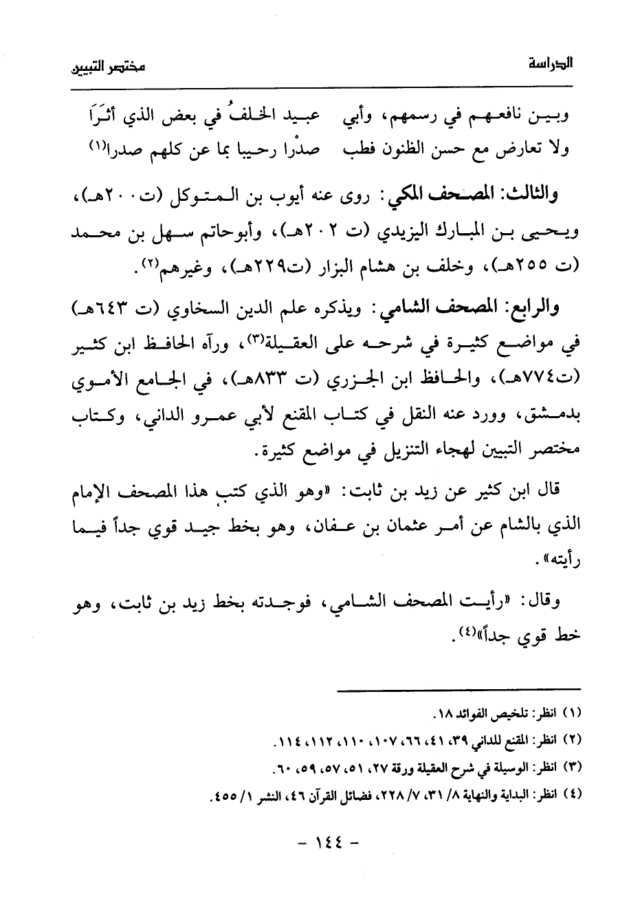 ويذكره علم الدين السخاوي (ت 643 هـ) في مواضع كثيرة في شرحه على العقيلة (¬3)، ورآه الحافظ ابن كثير (ت 774 هـ)، والحافظ ابن الجزري (ت 833 هـ)، في الجامع الأموي بدمشق، وورد عنه النقل في كتاب المقنع لأبي عمرو الداني، وكتاب مختصر التبيين لهجاء التنزيل في مواضع كثيرة.