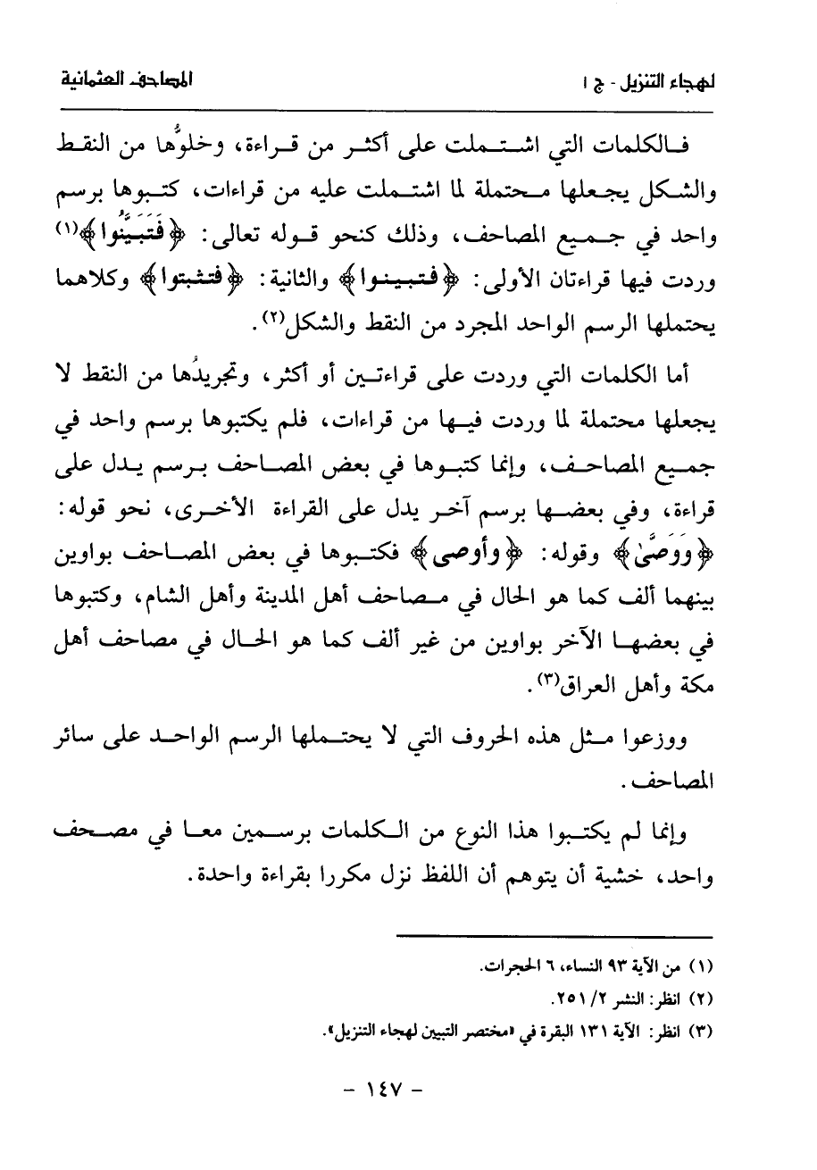 فالكلمات التي اشتملت على أكثر من قراءة، وخلوّها من النقط والشكل يجعلها محتملة لما اشتملت عليه من قراءات، كتبوها برسم واحد في جميع المصاحف، وذلك كنحو قوله تعالى: فتبيّنوا (¬1) وردت فيها قراءتان الأولى: فتبينوا والثانية: فتثبتوا وكلاهما يحتملها الرسم الواحد المجرد من النقط والشكل (¬2).