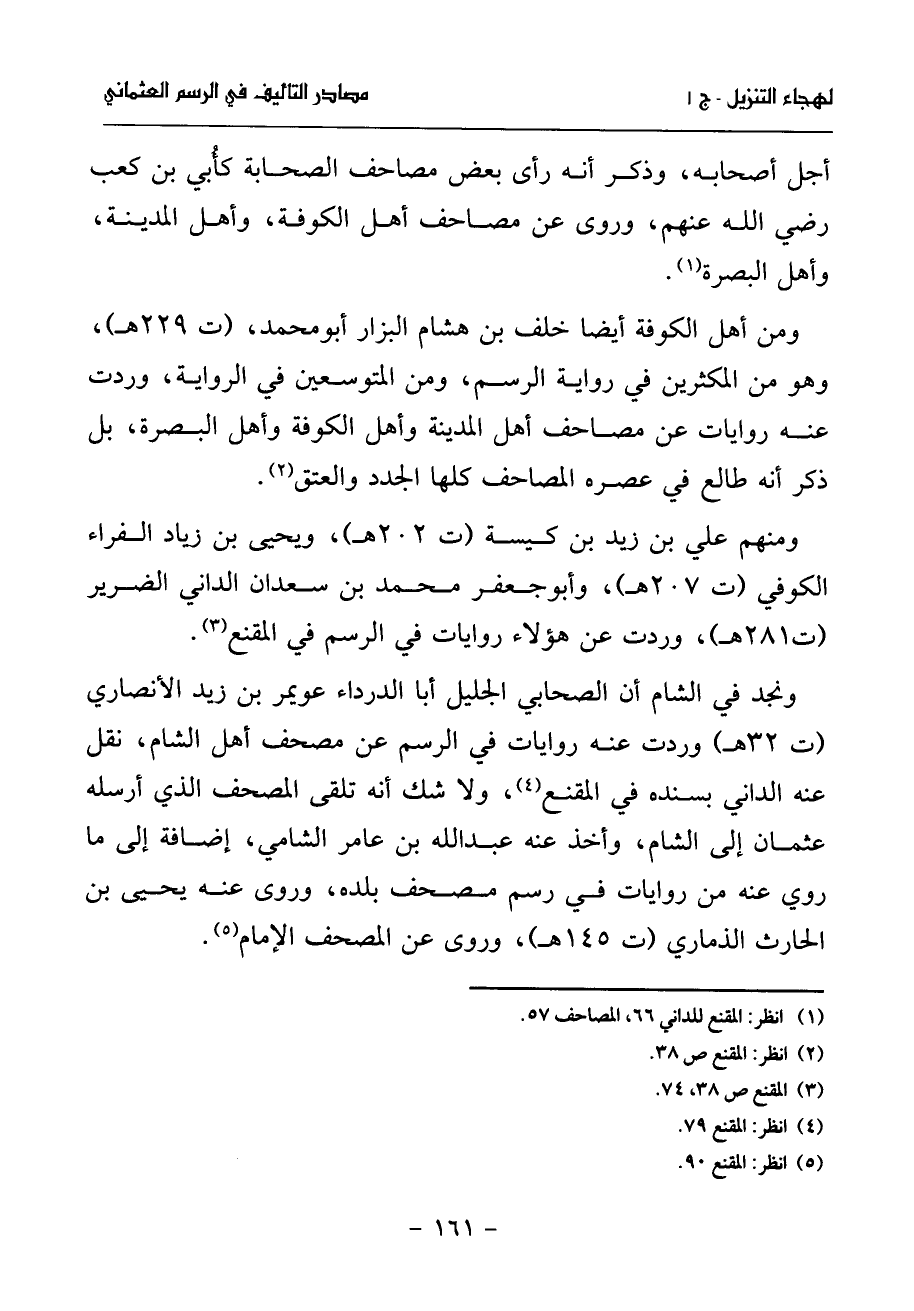 ونجد في الشام أن الصحابي الجليل أبا الدرداء عويمر بن زيد الأنصاري (ت 32 هـ) وردت عنه روايات في الرسم عن مصحف أهل الشام، نقل عنه الداني بسنده في المقنع (¬4)، ولا شك أنه تلقى المصحف الذي أرسله عثمان إلى الشام، وأخذ عنه عبد الله بن عامر الشامي، إضافة إلى ما روي عنه من روايات في رسم مصحف بلده، وروى عنه يحيى بن الحارث الذماري (ت 145 هـ)، وروى عن المصحف الإمام (¬5).