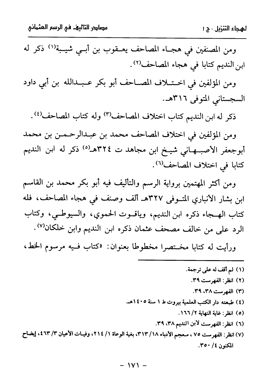 ومن المؤلفين في اختلاف المصاحف محمد بن عبد الرحمن بن محمد أبو جعفر الأصبهاني شيخ ابن مجاهد ت 324 هـ (¬5) ذكر له ابن النديم كتابا في اختلاف المصاحف (¬6).