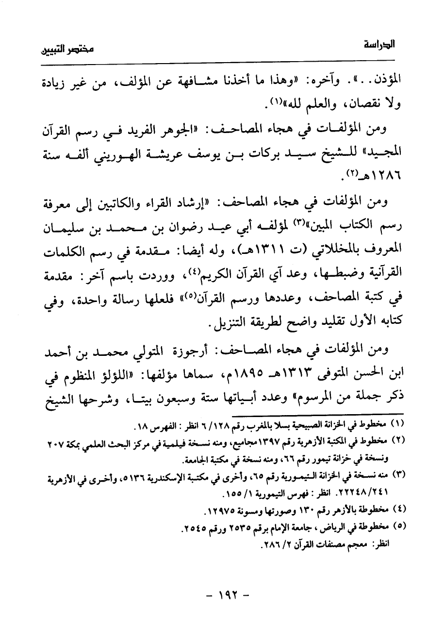 ومن المؤلفات في هجاء المصاحف: «الجوهر الفريد في رسم القرآن المجيد» للشيخ سيد بركات بن يوسف عريشة الهوريني ألفه سنة 1286 هـ (¬2).