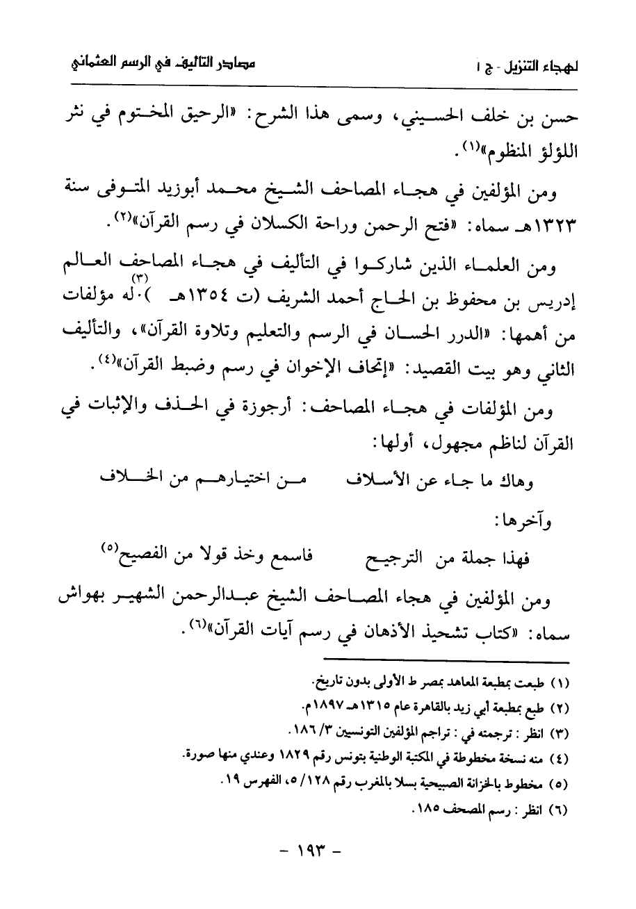 فهذا جملة من الترجيح* فاسمع وخذ قولا من الفصيح (¬5) ومن المؤلفين في هجاء المصاحف الشيخ عبد الرحمن الشهير بهواش سماه: «كتاب تشحيذ الأذهان في رسم آيات القرآن» (¬6).