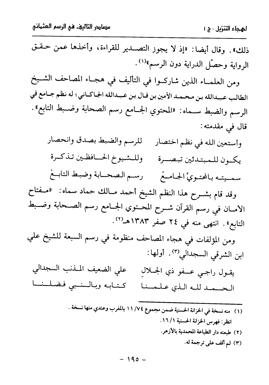 ومن المؤلفات في هجاء المصاحف منظومة في رسم السبعة للشيخ علي ابن الشرقي السجدالي (¬3). أولها:
