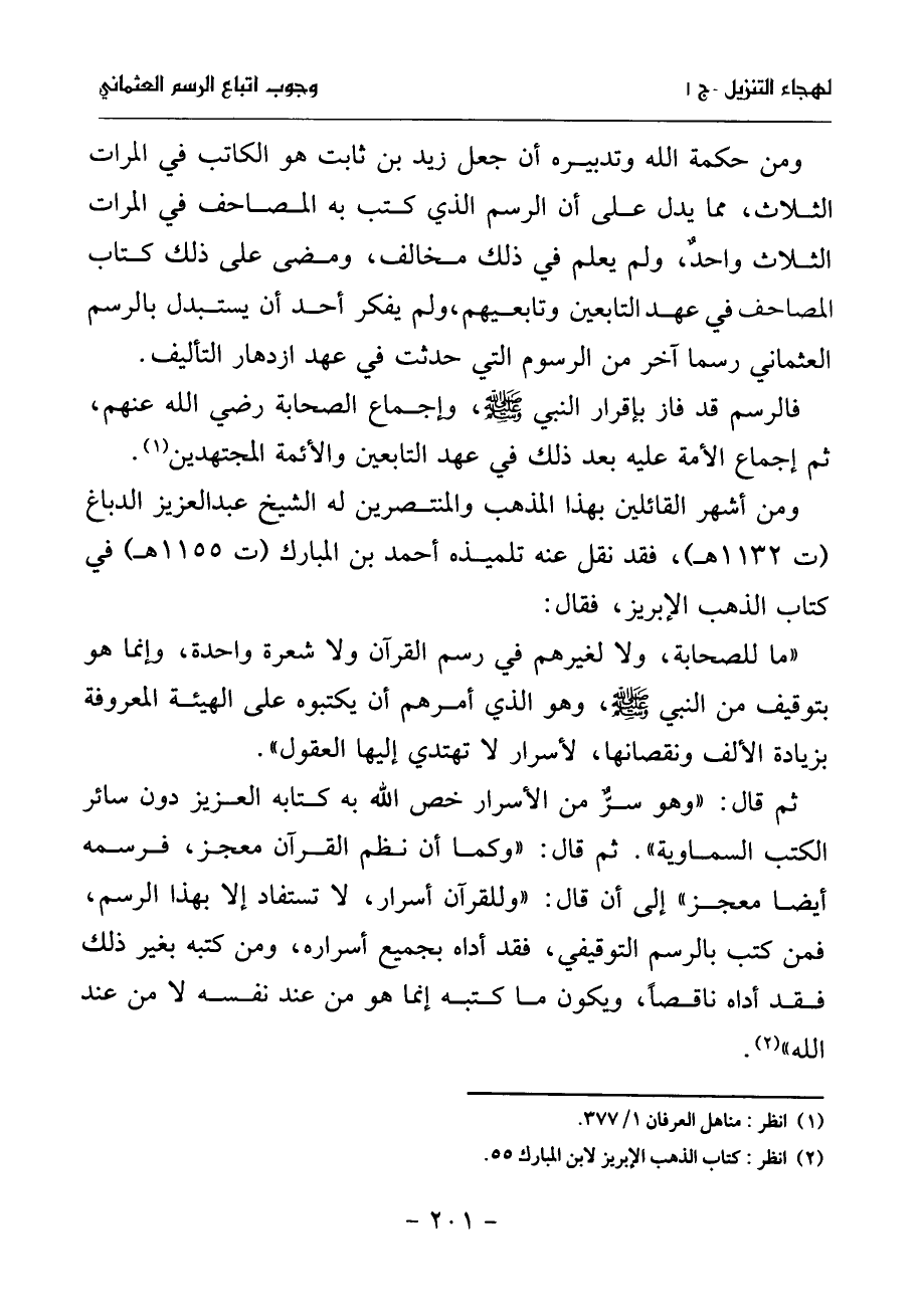 ثم قال: «وهو سرّ من الأسرار خص الله به كتابه العزيز دون سائر الكتب السماوية». ثم قال: «وكما أن نظم القرآن معجز، فرسمه أيضا معجز» إلى أن قال: «وللقرآن أسرار، لا تستفاد إلا بهذا الرسم، فمن كتب بالرسم التوقيفي، فقد أداه بجميع أسراره، ومن كتبه بغير ذلك فقد أداه ناقصا، ويكون ما كتبه إنما هو من عند نفسه لا من عند الله» (¬2).