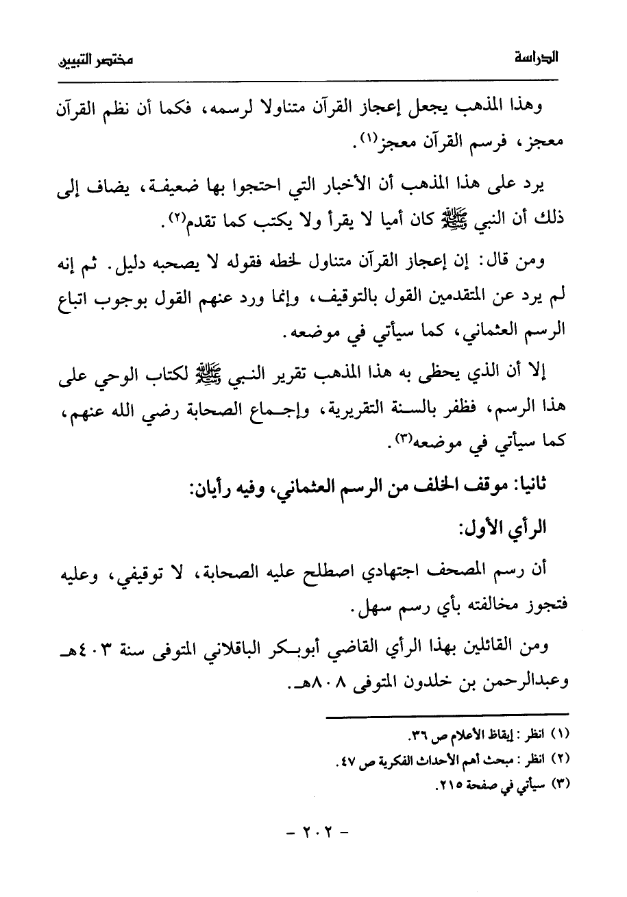 ومن قال: إن إعجاز القرآن متناول لخطه فقوله لا يصحبه دليل. ثم إنه لم يرد عن المتقدمين القول بالتوقيف، وإنما ورد عنهم القول بوجوب اتباع الرسم العثماني، كما سيأتي في موضعه.