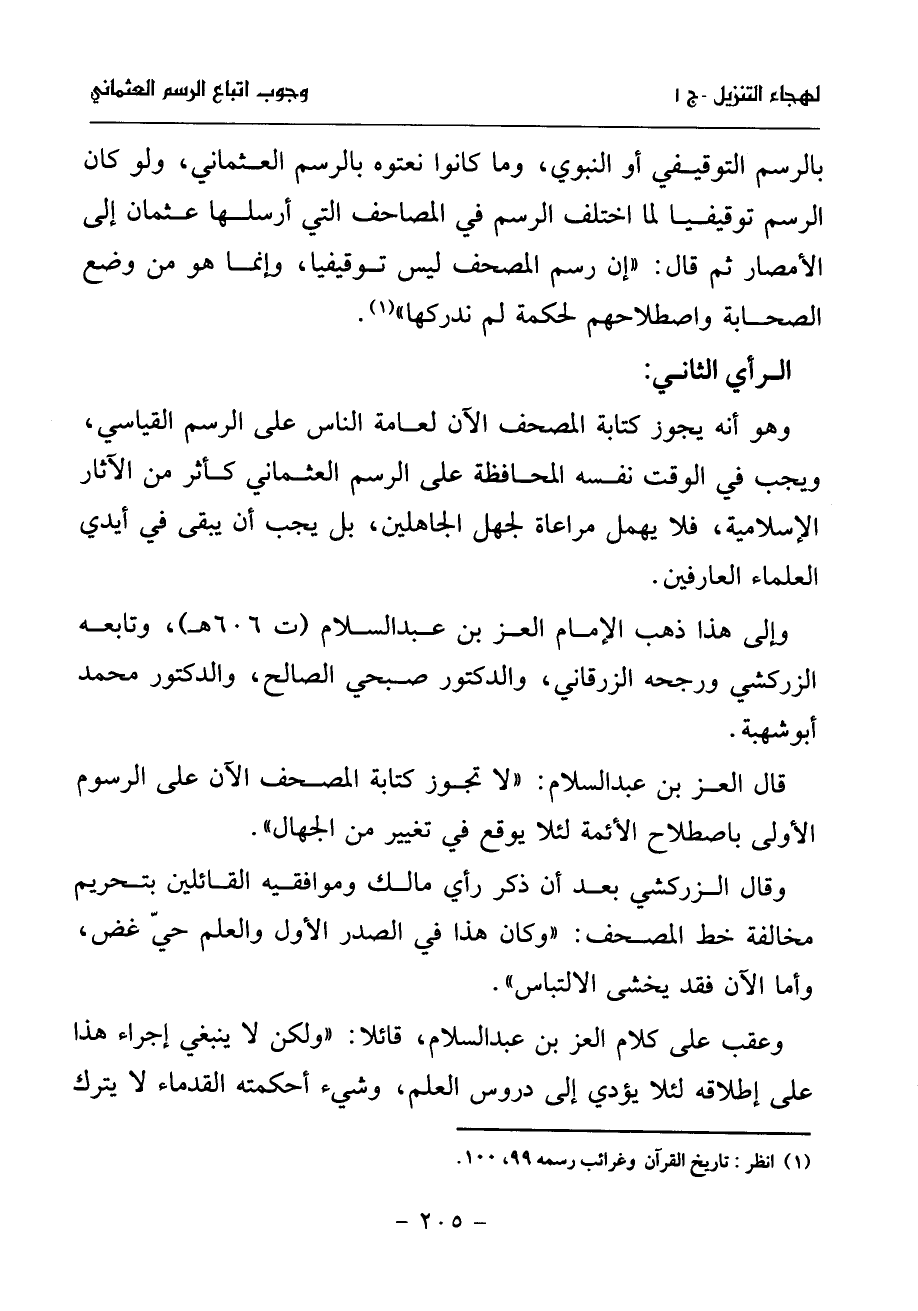 قال العز بن عبد السلام: «لا تجوز كتابة المصحف الآن على الرسوم الأولى باصطلاح الأئمة لئلا يوقع في تغيير من الجهال».