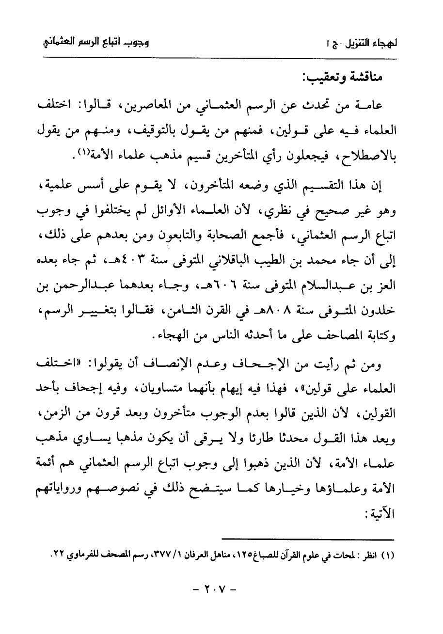 ومن ثم رأيت من الإجحاف وعدم الإنصاف أن يقولوا: «اختلف العلماء على قولين»، فهذا فيه إيهام بأنهما متساويان، وفيه إجحاف بأحد القولين، لأن الذين قالوا بعدم الوجوب متأخرون وبعد قرون من الزمن، ويعد هذا القول محدثا طارئا ولا يرقى أن يكون مذهبا يساوي مذهب علماء الأمة، لأن الذين ذهبوا إلى وجوب اتباع الرسم العثماني هم أئمة الأمة وعلماؤها وخيارها كما سيتضح ذلك في نصوصهم ورواياتهم الآتية: