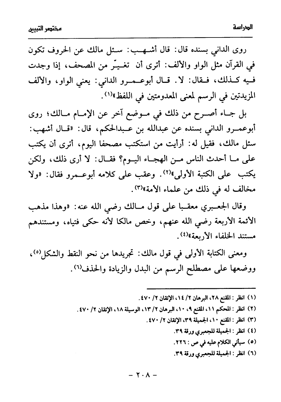 سئل مالك، فقيل له: أرأيت من استكتب مصحفا اليوم، أترى أن يكتب على ما أحدث الناس من الهجاء اليوم؟ فقال: لا أرى ذلك، ولكن يكتب على الكتبة الأولى» (¬2). وعقب على كلامه أبو عمرو فقال: «ولا مخالف له في ذلك من علماء الأمة» (¬3).