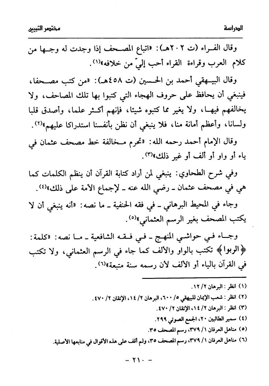 وقال البيهقي أحمد بن الحسين (ت 458 هـ): «من كتب مصحفا، فينبغي أن يحافظ على حروف الهجاء التي كتبوا بها تلك المصاحف، ولا يخالفهم فيها، ولا يغير مما كتبوه شيئا، فإنهم أكثر علما، وأصدق قلبا ولسانا، وأعظم أمانة منا، فلا ينبغي أن نظن بأنفسنا استدراكا عليهم» (¬2).