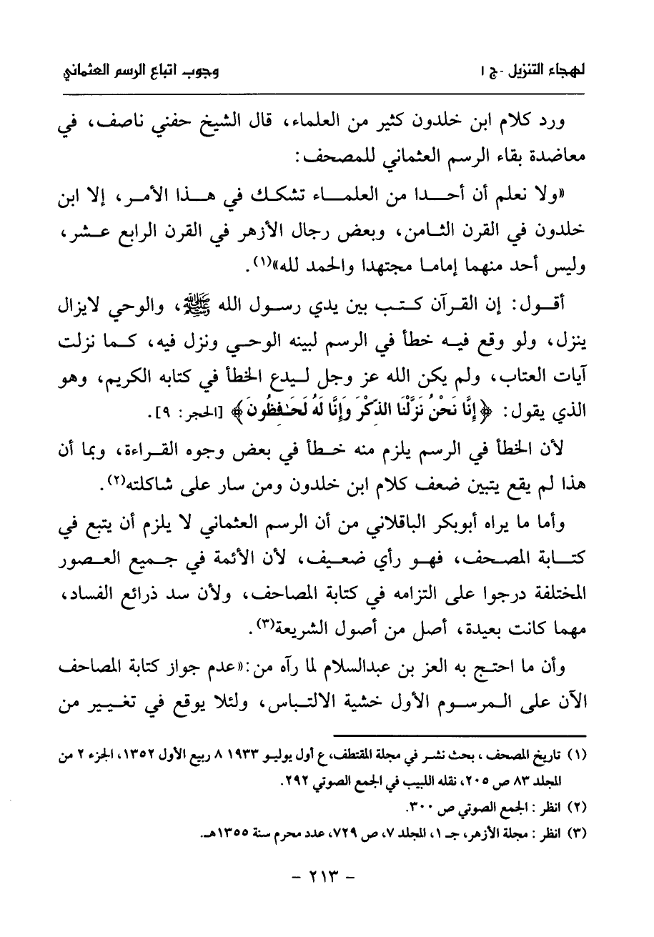 وأن ما احتج به العز بن عبد السلام لما رآه من: «عدم جواز كتابة المصاحف الآن على المرسوم الأول خشية الالتباس، ولئلا يوقع في تغيير من