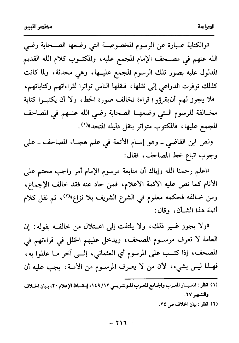 «والكتابة عبارة عن الرسوم المخصوصة التي وضعها الصحابة رضي الله عنهم في مصحف الإمام المجمع عليه، والمكتوب كلام الله القديم المدلول عليه بصور تلك الرسوم المجمع عليها، وهي محدثة، ولما كانت كذلك توفرت الدواعي إلى نقلها، فنقلها الناس تواترا لقراءاتهم وكتاباتهم، فلا يجوز لهم أن يقرءوا قراءة تخالف صورة الخط، ولا أن يكتبوا كتابة مخالفة للرسوم التي وضعها الصحابة رضي الله عنهم في المصاحف المجمع عليها، فالمكتوب متواتر بنقل دليله المتحد» (¬1).