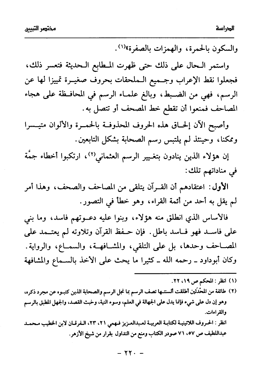 (¬2) طائفة من المحدثين أطلقت ألسنتها تصف الرسم بما نجل الرسم والصحابة الذين كتبوه عن مجرد ذكره، وهو إن دل على شيء فإنما يدل على الجهالة في العلم، وسوء النية، وخبث القصد، والجهل المطبق بالرسم والقراءات.