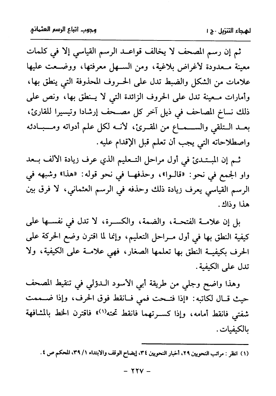 ثم إن المبتدئ في أول مراحل التعليم الذي عرف زيادة الألف بعد واو الجمع في نحو: «قالوا»، وحذفها في نحو قوله: «هذا» وشبهه في الرسم القياسي يعرف زيادة ذلك وحذفه في الرسم العثماني، لا فرق بين هذا وذاك.