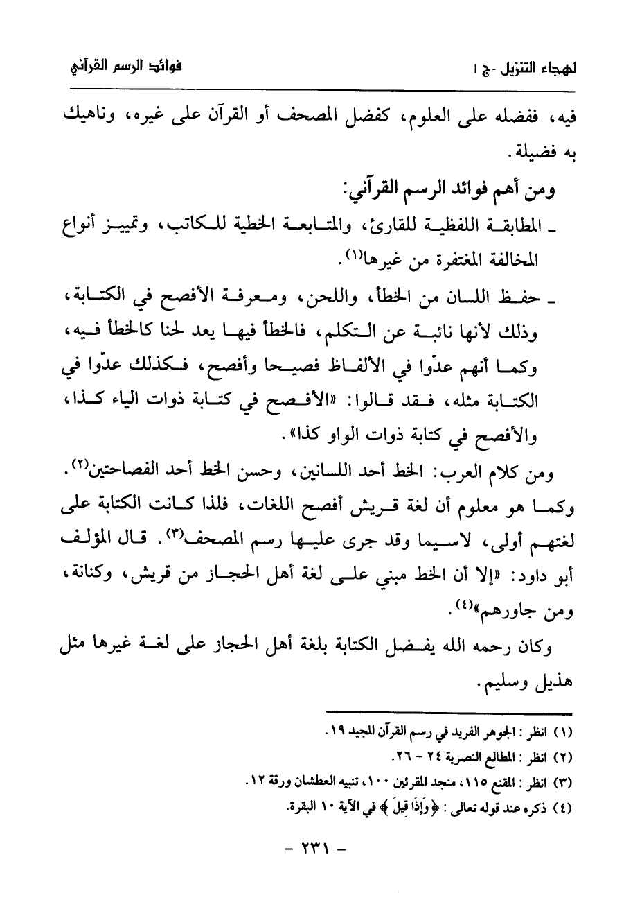 وكما هو معلوم أن لغة قريش أفصح اللغات، فلذا كانت الكتابة على لغتهم أولى، لا سيما وقد جرى عليها رسم المصحف (¬3). قال المؤلف أبو داود: «إلا أن الخط مبني على لغة أهل الحجاز من قريش، وكنانة، ومن جاورهم» (¬4).