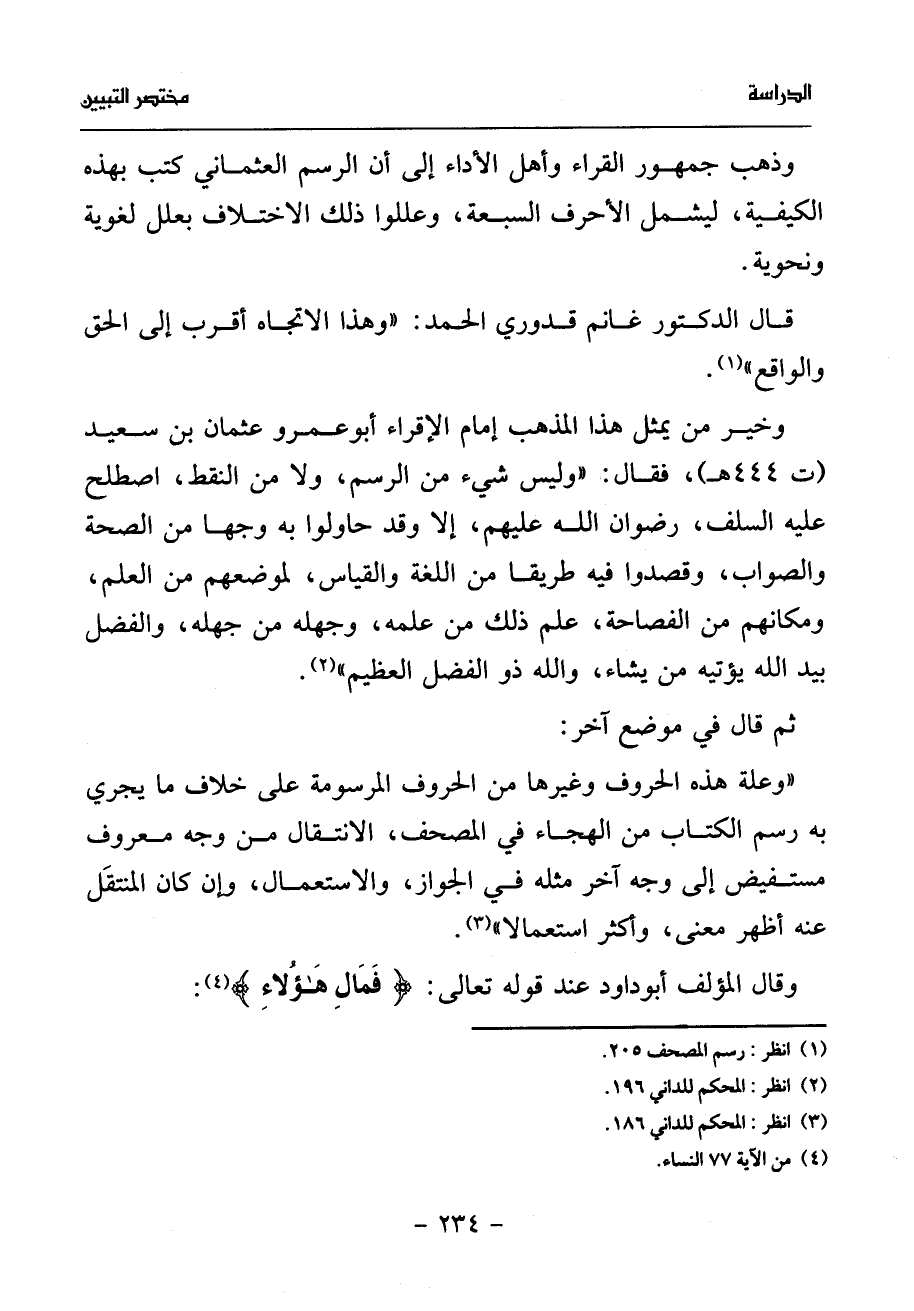 وخير من يمثل هذا المذهب إمام الإقراء أبو عمرو عثمان بن سعيد (ت 444 هـ)، فقال: «وليس شيء من الرسم، ولا من النقط، اصطلح عليه السلف، رضوان الله عليهم، إلا وقد حاولوا به وجها من الصحة والصواب، وقصدوا فيه طريقا من اللغة والقياس، لموضعهم من العلم، ومكانهم من الفصاحة، علم ذلك من علمه، وجهله من جهله، والفضل بيد الله يؤتيه من يشاء، والله ذو الفضل العظيم» (¬2).