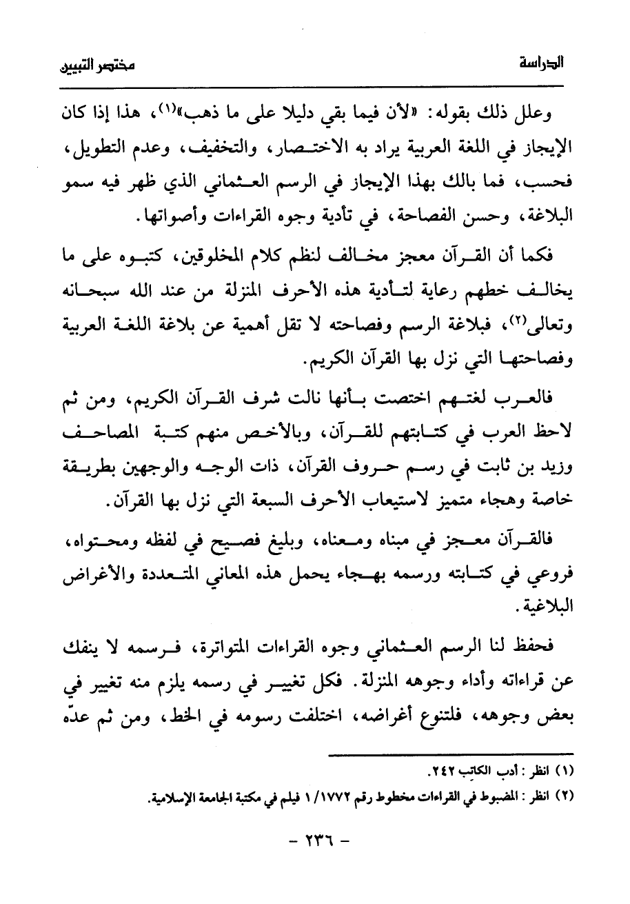 وعلل ذلك بقوله: «لأن فيما بقي دليلا على ما ذهب» (¬1)، هذا إذا كان الإيجاز في اللغة العربية يراد به الاختصار، والتخفيف، وعدم التطويل، فحسب، فما بالك بهذا الإيجاز في الرسم العثماني الذي ظهر فيه سمو البلاغة، وحسن الفصاحة، في تأدية وجوه القراءات وأصواتها.