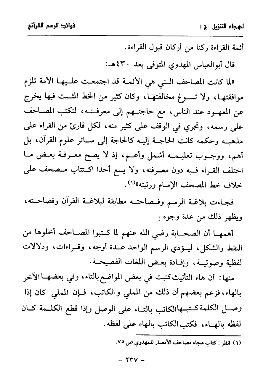 «لما كانت المصاحف التي هي الأئمة قد اجتمعت عليها الأمة تلزم موافقتها، ولا تسوغ مخالفتها، وكان كثير من الخط المثبت فيها يخرج عن المعهود عند الناس، مع حاجتهم إلى معرفته، لتكتب المصاحف على رسمه، وتجري في الوقف على كثير منه، لكل قارئ من القراء على مذهبه وحكمه كانت الحاجة إليه كالحاجة إلى سائر علوم القرآن، بل أهم، ووجوب تعليمه أشمل وأعم، إذ لا يصح معرفة بعض ما اختلف القراء فيه دون معرفته، ولا يسع أحدا اكتتاب مصحف على خلاف خط المصحف الإمام ورتبته» (¬1).