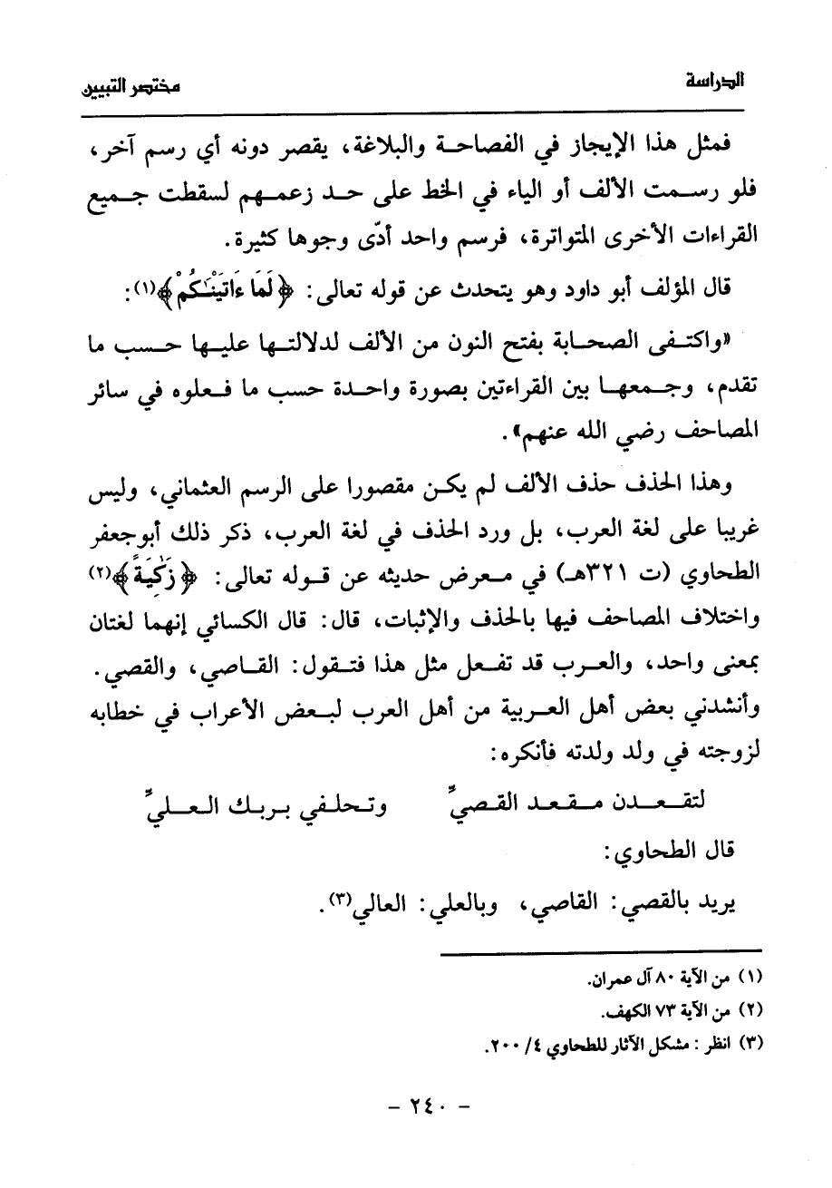 وهذا الحذف حذف الألف لم يكن مقصورا على الرسم العثماني، وليس غريبا على لغة العرب، بل ورد الحذف في لغة العرب، ذكر ذلك أبو جعفر الطحاوي (ت 321 هـ) في معرض حديثه عن قوله تعالى: زكية (¬2) واختلاف المصاحف فيها بالحذف والإثبات، قال: قال الكسائي إنهما لغتان بمعنى واحد، والعرب قد تفعل مثل هذا فتقول: القاصي، والقصي.