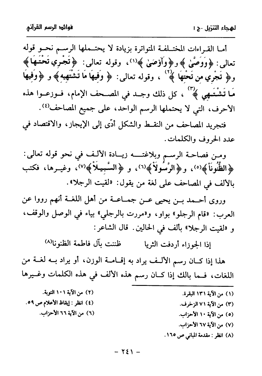 إذا الجوزاء أردفت الثريا* ظننت بآل فاطمة الظنونا (¬8) هذا إذا كان رسم الألف يراد به إقامة الوزن، أو يراد به لغة من اللغات، فما بالك إذا كان رسم هذه الألف في هذه الكلمات وغيرها